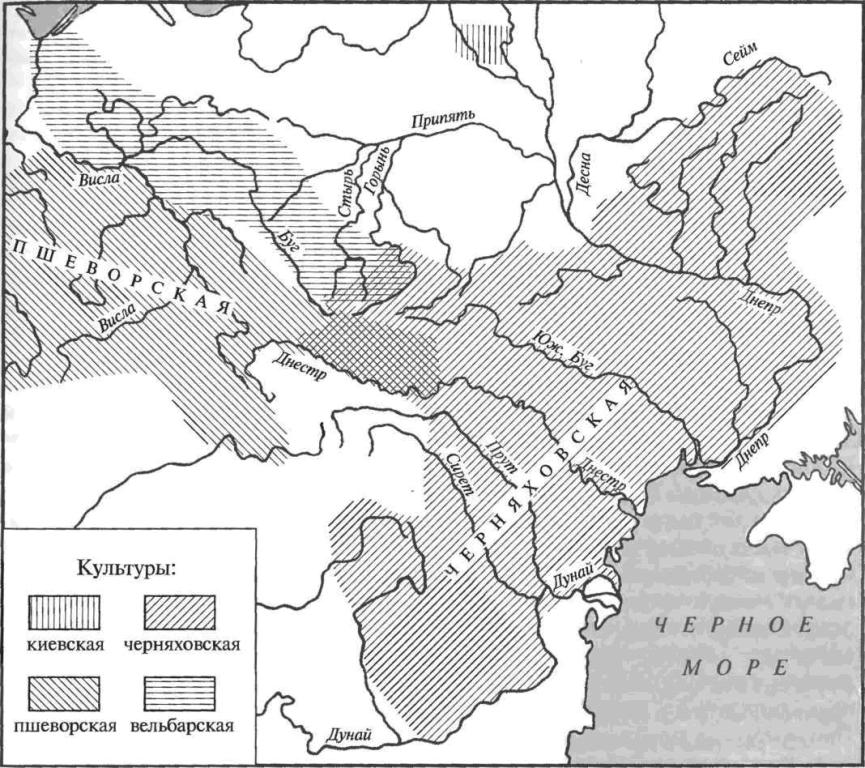 На рубеже II-III вв. н.э. в пределах леса и лесостепи в северной части Среднего и южной части Верхнего Поднепровья, на территории Подесенья и смежных районов левобережья Днепра складывается киевская культура, памятники которой существуют до середины V в. Процесс ее формирования связан со сложным взаимодействием пост- или позднезарубинецких племен, различных местных и проникавших сюда с запада — пшеворских группировок (см. выше).