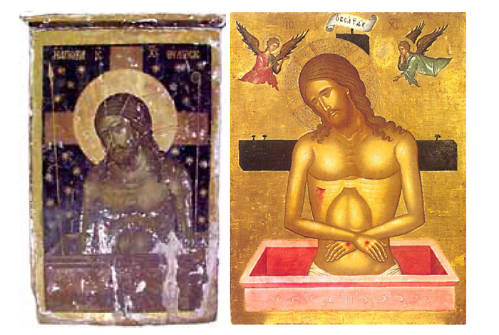 Сложнее с определением фигур держащих Христа за руки у локтей. Известны изображения умершего Христа поддерживаемого ангелами. Этот сюжет используется западными художниками XIV-XV веков. Варианты различны - один, два или три ангела поддерживают тело умершего Христа.