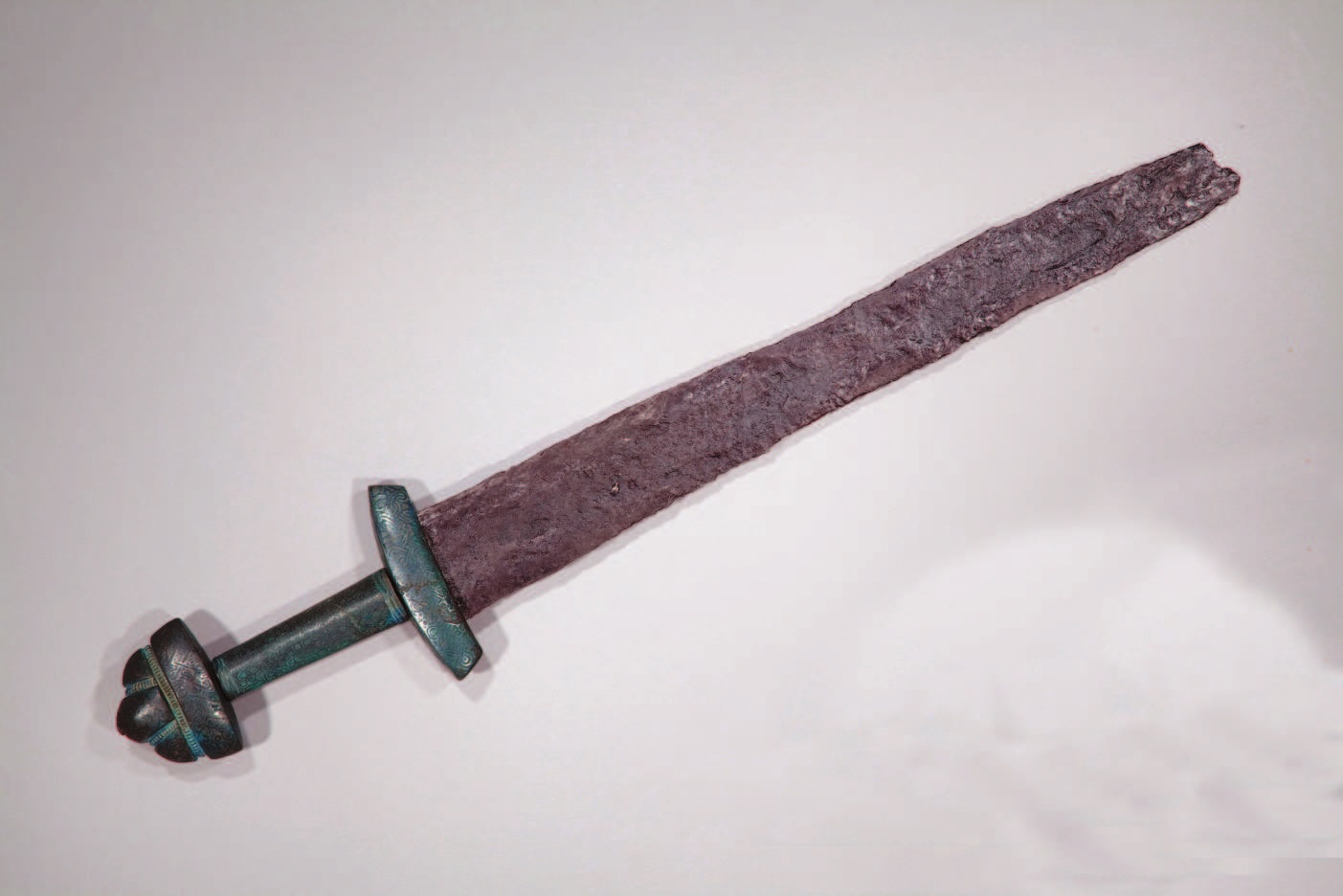 Металлографический анализ показал, что перекрестие и навершие выполнены из похожего сплава, представляющего собой бронзу с низким содержанием олова. В составе сплава трубки олова еще меньше, чем в бронзе перекрестия и навершия. Черневой орнамент нанесен с помощью сплава, содержащего свинец в значительно большем количестве, чем бронза основы. Он представляет собой темные окислы свинца и меди.