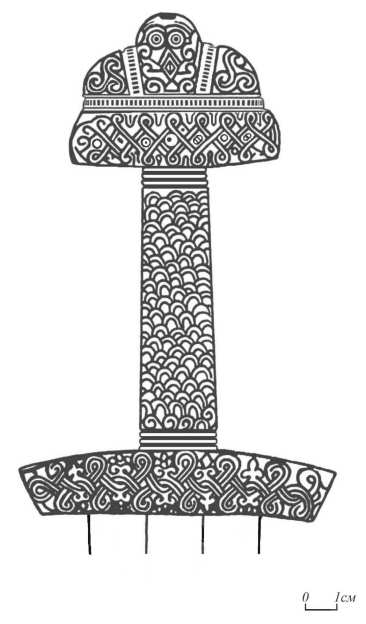 Представляется логичным, что излюбленный сюжет изображений на щитах послужил основой для орнаментальной композиции бронзовой рукояти меча из Пурдошек. В качестве подтверждения данного утверждения может служить меч из Фощеватой, где рукоять, орнамент которой выполнен в скандинавской традиции, смонтирована с клинком, изготовленным древнерусским мастером Людотой24.