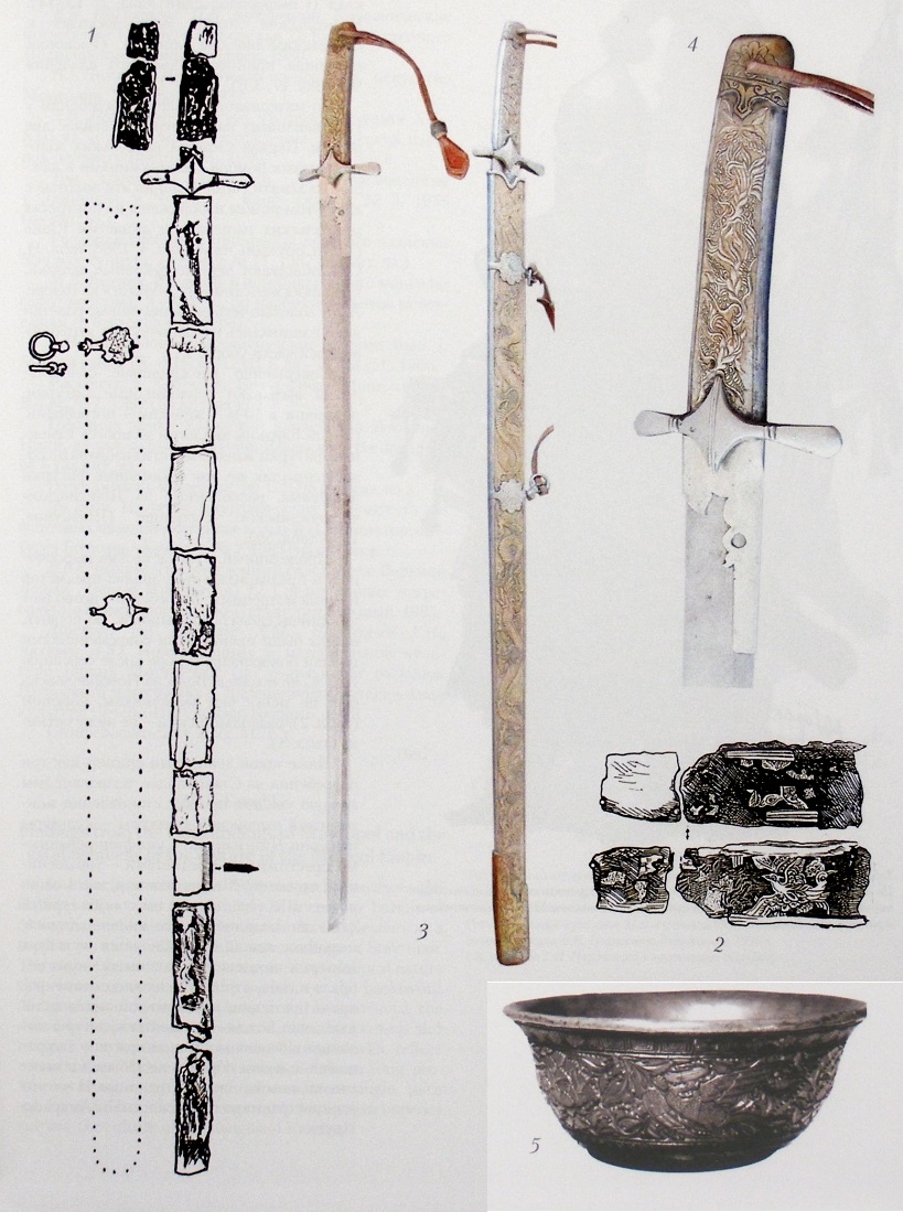 1 – палаш из погребения нойона у г. Новопавловск, Ставропольский объединенный музей. рис. М В. Горелика, 1987 г.; 2 – рукоять палаша, бронза, кость, резьба; 3-4 – реконструкция палаша из Новопавловска, автор М. В. Горелик, мастер Ю. А. Тихонов. 1989 г. Ставропольский объединенный музей; 5 – чаша из резного черного лака, Китай, середина XIII н. Линден-музеум. Штуттгарт