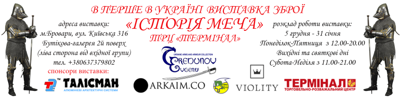 В Броварском ТРЦ "Терминал" открылась выставка клинкового оружия, которая продлится до конца января. В экспозиции представлены экспонаты из собственной коллекции новоизбранного депутата Броварского городского совета Евгения Гредунова, спонсорами выставки выступают ООО Талисман и ООО Полимер Колор. Экспонаты размещены в бутиков зоне на втором этаже торгово-развлекательного центра.