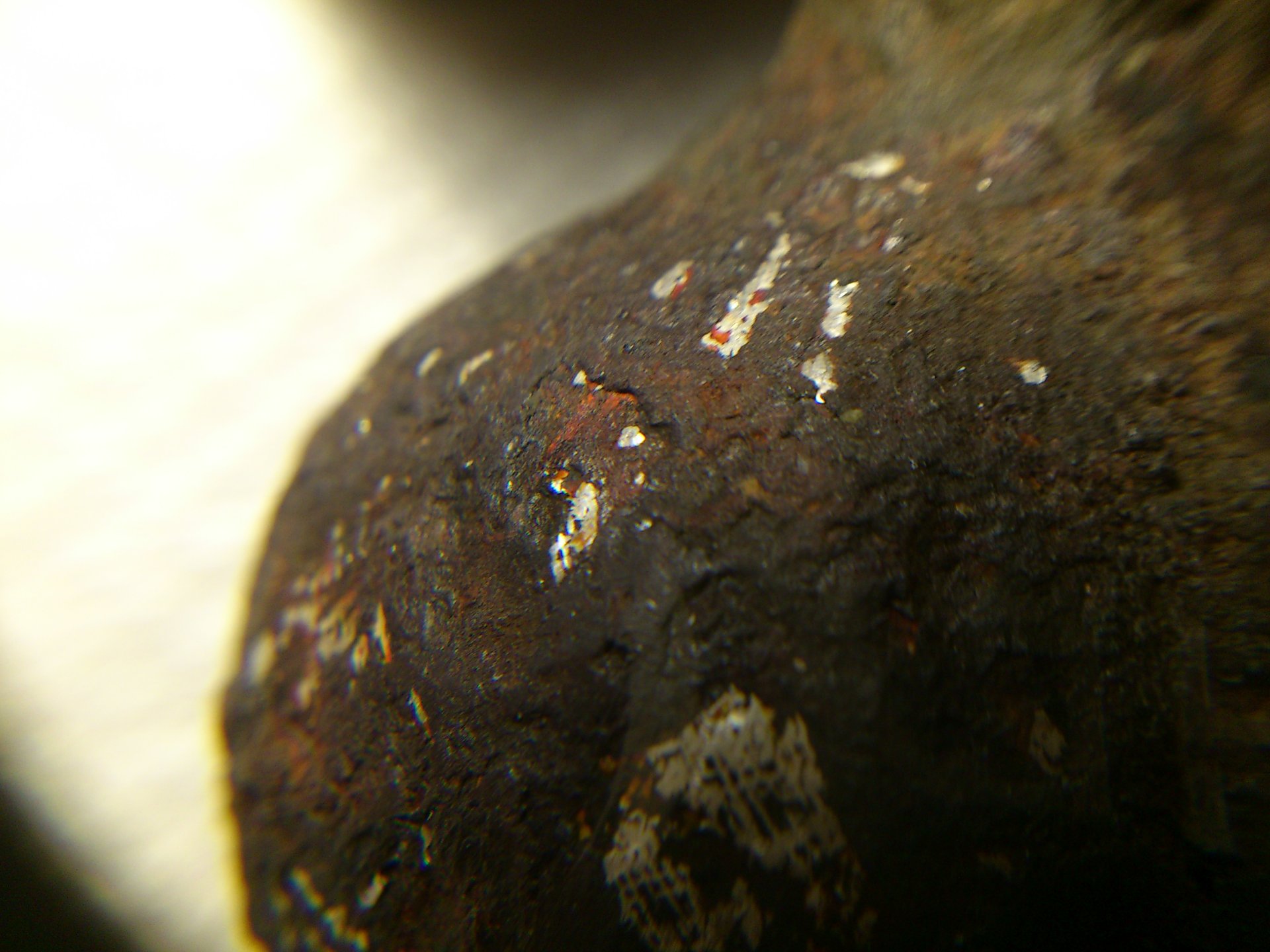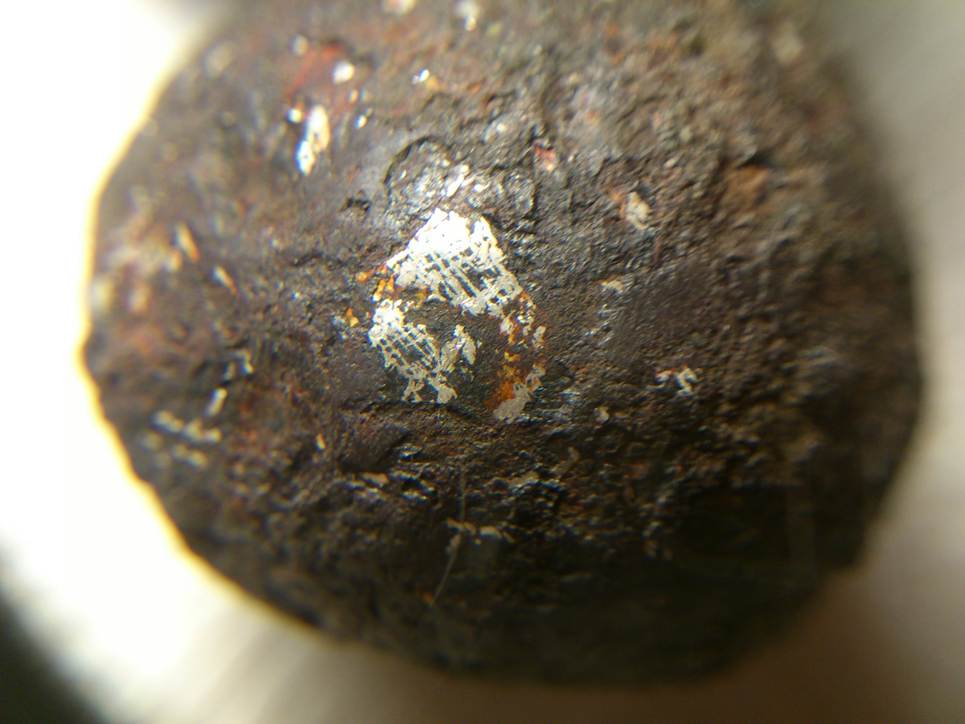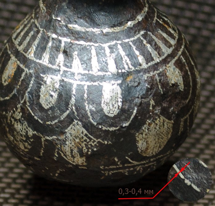 В процессе расчистки кистеня стал вникать в подробности тонкой работы древних мастеров. Провёл доступные мне промеры таушировки. Насечки на теле предмета нанесены на расстоянии примерно 0,4 мм ( 2,5 линии на 1 мм). Ширина линий серебряной всечки колеблется от 0,3 до 0,4 мм. А толщина самого серебра составляет 0,1 мм. А это значит что пользовались серебряной проволокой диаметром около 0,15-0,2 мм. Есть о чём задуматься по технике работы мастеров того времени. Пруф