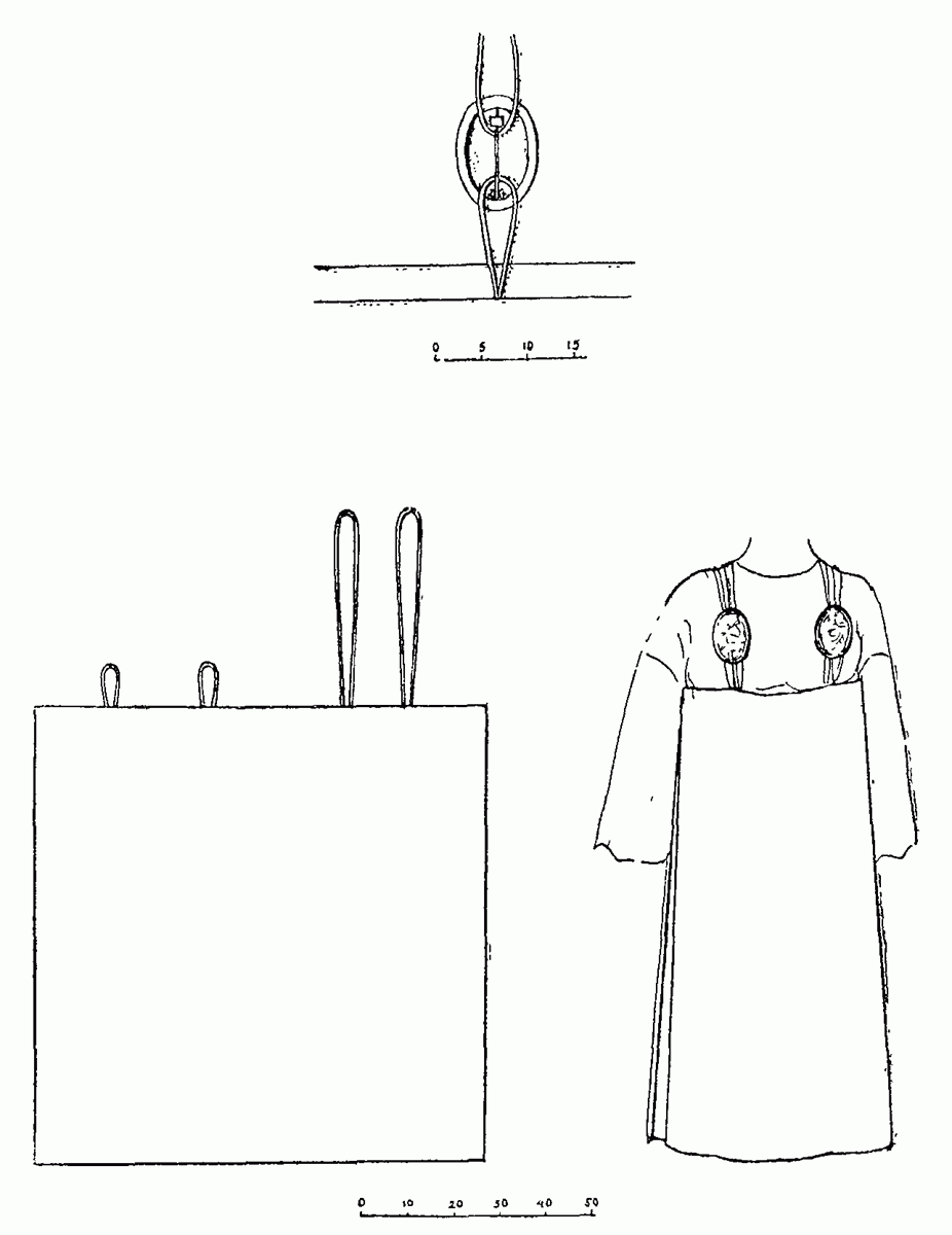 Следует заметить, что фибулы одновременно служили и для прикрепления к ним на цепочке вещей, необходимых в повседневном быту: ножниц, ножей, ключей, игольников, кошельков, гребней и т. п. Чаще всего шнурок или цепочка с этими предметами подвешивалась к правой фибуле; иногда ще для этой цели прикалывали к платью третью фибулу – равноплечную, трилистную или небольшую круглую, которую помещали обычно между овальными фибулами.