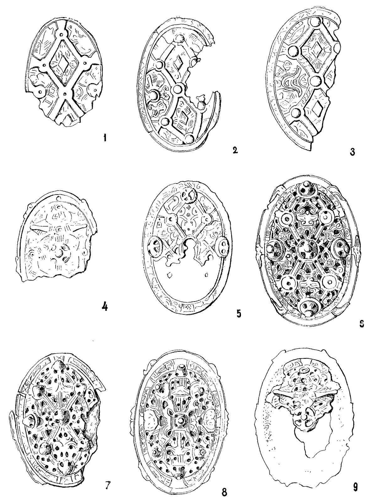 Для IX в. характерны фибулы, состоящие из бронзовой или серебряной литой овальной формы чаши — скорлупки с узким ободком и покрытой орнаментом поверхностью.