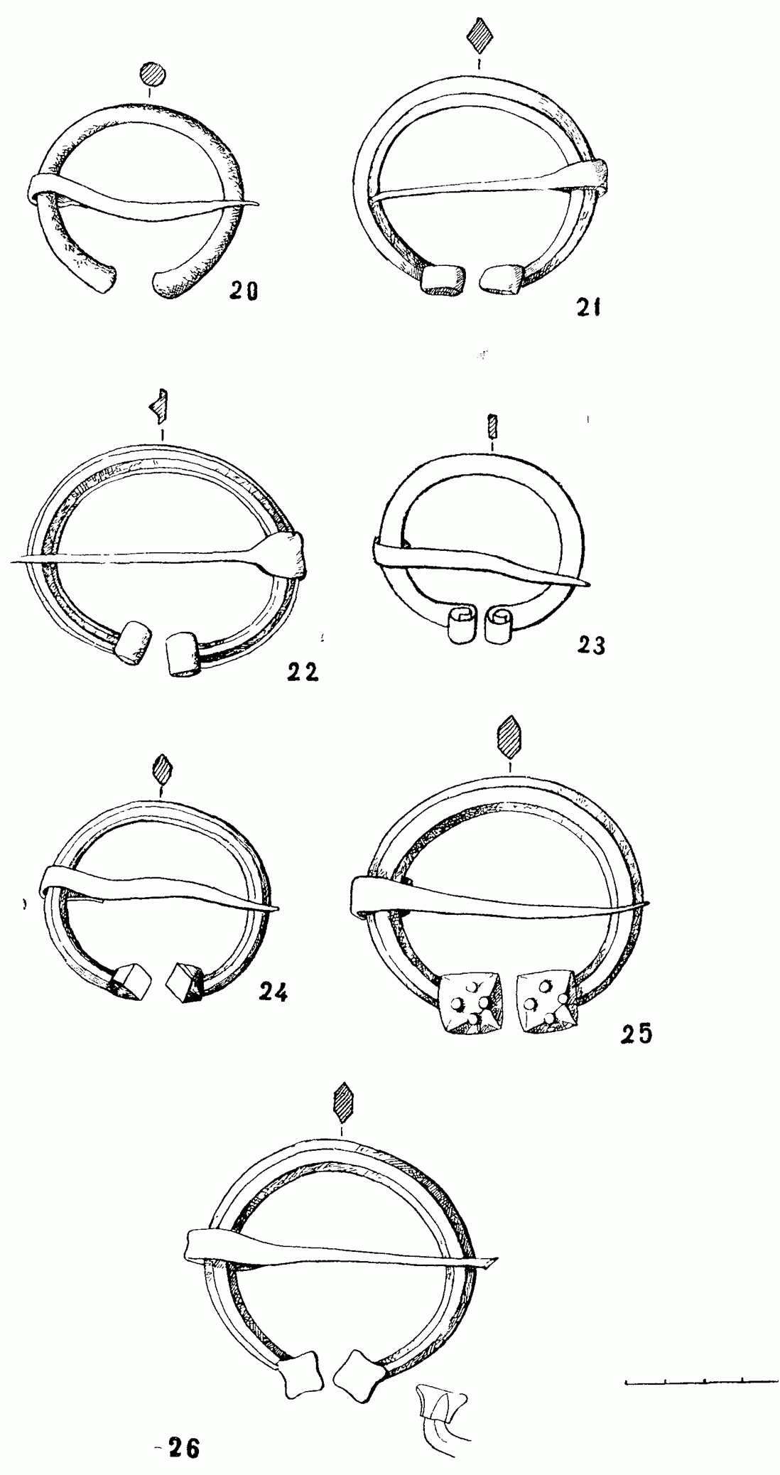 Из всех употреблявшихся в IX-X вв. фибул наиболее простыми по форме и несложными по изготовлению являются застежки подковообразные. Выполненные из железа, а чаще всего из бронзы, они имели дугу различного сечения, украшенную нередко чеканным или гравированным геометрическим орнаментом. Концы фибул спирально загнуты или в виде многогранных головок; известны также застежки с утолщенными, как бы обрубленными концами. Подковообразные фибулы, в отличие от других видов застежек, встречаются в рядовых захоронениях. Они были особенно широко распространены в Прибалтике и в Финляндии; по всей видимости, эти страны являлись родиной этого типа украшения. Так, чисто финским типом считаются подковообразные фибулы с утолщенными концами и с концами в виде многогранных головок, снабженных шипами, а застежки с воронкообразными головками на концах являются наиболее характерными для Прибалтики15. Большое количество находок подковообразных фибул известно в Скандинавии, а также на территории Руси в областях с финно-угорским населением.