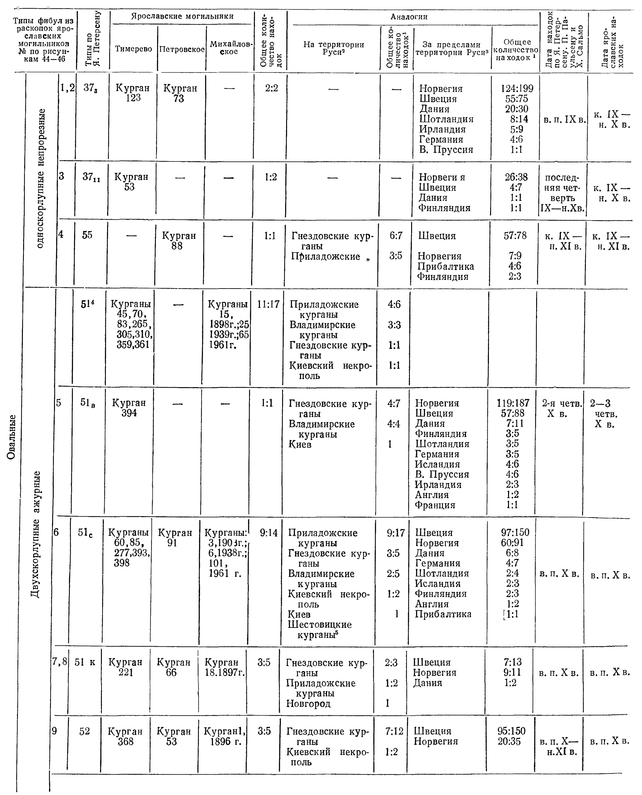 Обилие находок овальных фибул на территории Скандинавии способствовало установлению точных датировок не только для отдельных типов скорлупообразных застежек, но и для ряда их вариантов (рис. 44). При этом чрезвычайно важным является вывод П. Паульсена, что датировки фибул, найденных вне пределов Скандинавии, и в частности на территории Руси, совпадает со временем их распространения в Скандинавских странах13. Действительно, при проверке датировки курганов с фибулами выяснилось, что время бытования их на Руси почти всегда совпадает с датами скандинавского материала14.