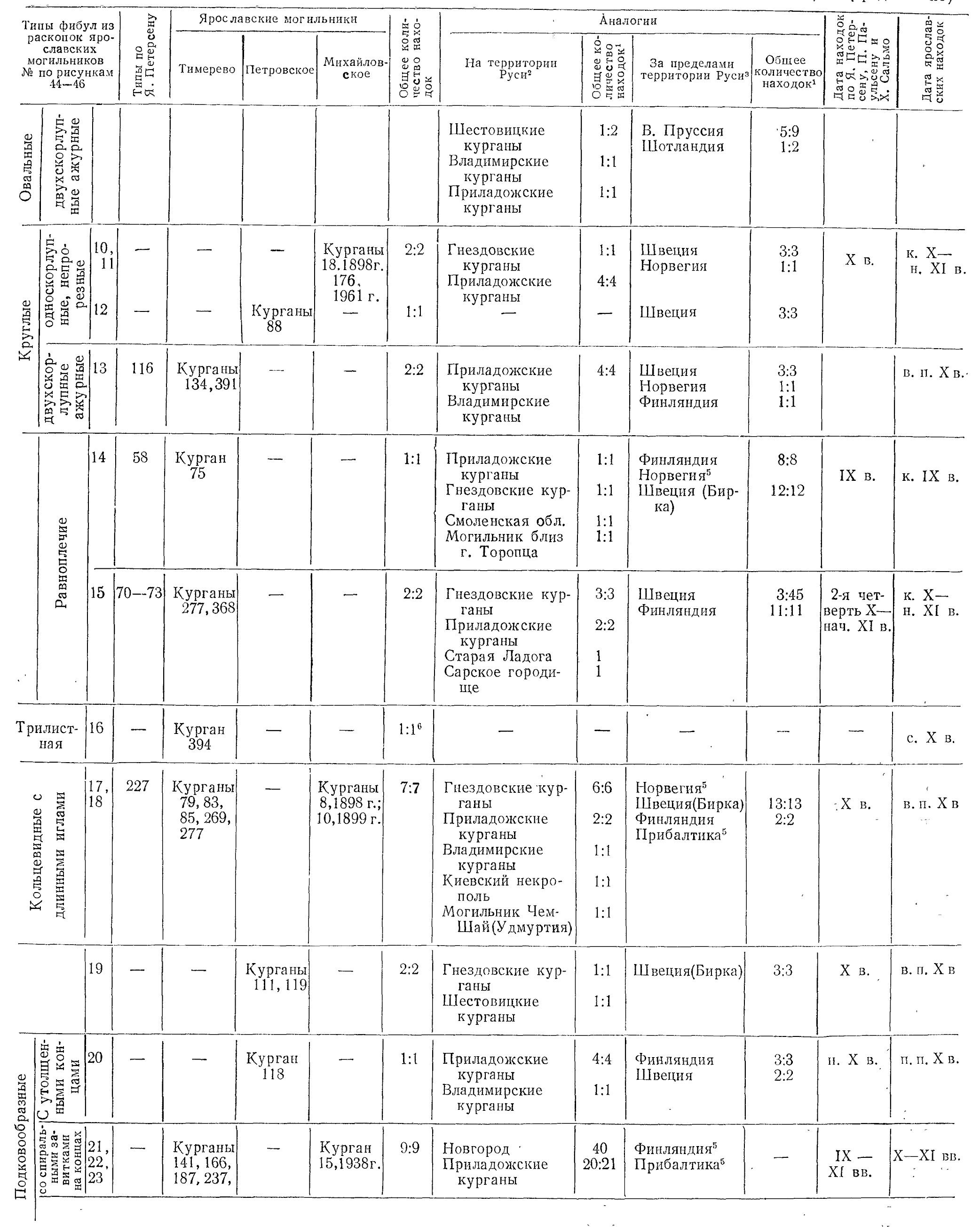 Следует подчеркнуть, что в ярославских могильниках фибулы находятся только в погребениях с трупосожжениями, произведенными как на месте насыпки курганов, так и на стороне. Единственным исключением является курган 394 Тимеревского могильника, где овальная и трилистная застежки найдены при костяке. По-видимому, это захоронение, как ранее отмечалось, может быть отнесено к скандинавским.
