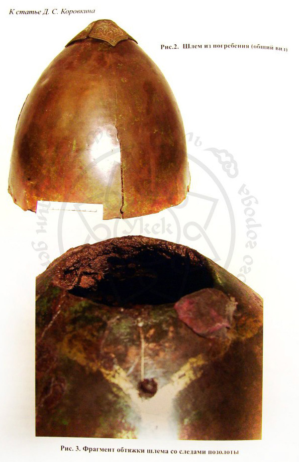 Сфероконические шлемы состоят из четырех склепанных пластин, обтянутых медно-бронзовой позолоченной обтяжкой, со втулкой на макушке3. Эти шлемы из кочевнических могил изготовлены «или на Руси, или… более вероятно, в кочевнических мастерских Восточной Европы, знакомых с русской оружейной продукцией»4.