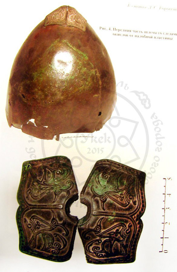 Начельное украшение, ромбовидной формы, не сохранилось, но его следы четко прослеживаются на поверхности шлема»2.