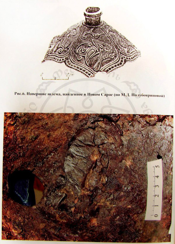Навершие шлема из медесодержащего сплава (бронза либо латунь) в настоящий момент представлено его основанием, состоящим из двух частей, ранее соединенных пайкой воедино (рис. 5). Каждая часть имеет два орнаментированных поля специфической крино-ромбовидной формы. Орнаментальные поля окантованы рельефными линиями и полосой полусферических выступов. В центре каждою поля помещено образованное рельефными линиями изображение сидящей птицы с длинным клювом, хохолком на голове, пышным хвостом и поднятыми крыльями, от которых отходит растительный побег. Тело птицы украшено изображением ростка трилистника (крина). Высота навершия составляет порядка 48 мм. Толщина элементов навершия колеблется от 0.8 до 2,2 мм. Характер оборотной стороны деталей (отсутствие контура рисунка), особенности рельефа и характер обработки орнамента позволяют сделать вывод о том, что они были отлиты, а затем орнамент был доработан штихелями. К сожалению, следы позолоты, отмеченные Е.К. Максимовым, в настоящий момент не сохранились. Основание навершия крепилось к шлему четырьмя металлическими заклепками диаметром 2-2,5 мм, шляпки которых спеклись с деталями основания. В верхней части каждой детали имеется по два маленьких отверстия диаметром не больше 1,5 мм, посредством которых, по мнению Е.К. Максимова. крепилась верхняя часть навершия. Благодаря находке аналогичного относительно целого навершия в ходе археологических исследований Нового Сарая (инв. № Сар-15), мы можем утверждать, что верхняя часть навершия состояла из полой трубки с валикообразным утолщение наверху (рис. 6)1.