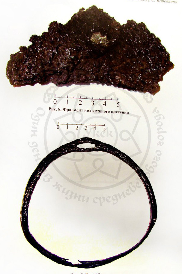 Остатки кольчужного плетения в погребении в настоящий момент представлены одним фрагментом (инв. № ЭКМ 297/3), по состоянию которого невозможно определить ни диаметр колец, ни диаметр проволоки (рис. 8). По публикации Е.К. Максимова кольчужная сетка была изготовлена из круглых в сечении колец диаметром 7-8 мм.