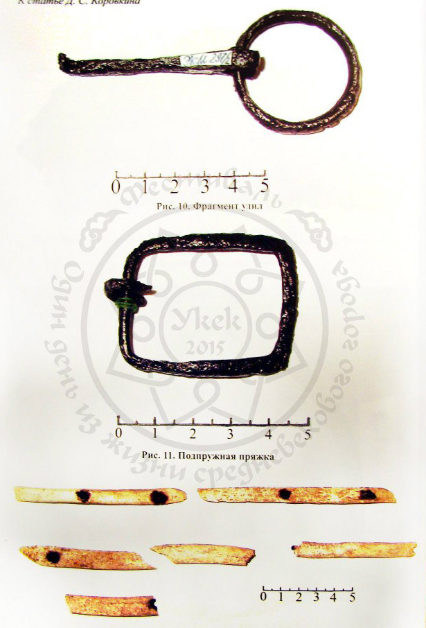 Из трех обнаруженных удил лучше сохранились одни, которые и отреставрированы (инв. № ЭКМ 297/2). Удила состоят из одного фрагмента трензеля, на конце которого располагается кольцо в форме короткого цилиндра, свернутого из расплющенного конца трензеля, в которое вставлено круглое подвижное кольцо (рис. 10).
