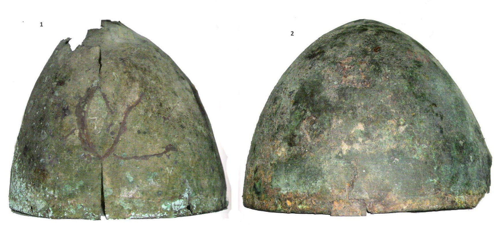 В Новочеркасском музее истории донского казачества хранятся два однотипных сфероконических шлема, обнаруженные в конце ХIХ -начале ХХ вв. На вершине оба имеют отверстия для крепления навершия с втулкой-гнездом для плюмажа или султанчика. Основания шлемов прямые. Снаружи каркас из железных пластин обтягивался листом бронзы. В одном случае сохранились фрагменты бронзового покрытия с остатками железного каркаса (III-348), в другом железный каркас сохранился более полно (III–347).