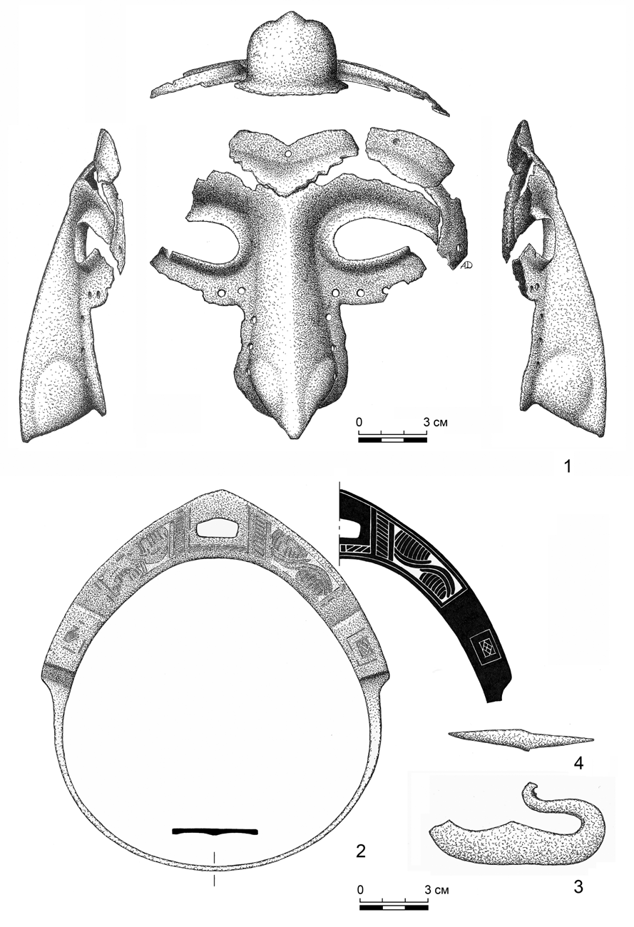 Первоначально полумаска представляла собой Т-образный глубоко профилированный анатомический наносник, переходящий в профилированные же дугообразные брови, основа которых составляет единое целое с нижними дугами, очерчивающими глаза (рис. 1: 1). Общая высота находки — 13,9 см, первоначальная ширина — 17,8 см. Кончик носа клювовидный, с обозначенными крыльями, имеет замкнутую пирамидальную структуру. Смотровые щели миндалевидной формы, высотой 1,8 см и шириной 4,2 см. Края смотровых щелей отогнуты наружу, имитируя веки. По краю нижних дужек и узким площадкам, отогнутым в горизонтальной плоскости по боковым сторонам носа, располагаются отверстия диаметром 2,5 мм под крепление бармицы. Всего их сохранилось пять с правой стороны и шесть с левой, остальные разрушены коррозией, при этом с каждой стороны непосредственно на носу расположено по три отверстия. Изначально полумаска крепилась к шлему пятью заклёпками. Сохранилось три монтажных отверстия под них, каждое диаетром 4 мм. Толщина металла полумаски в среднем 2,5 мм. Общий вес находки в целом – 175 г. По всей поверхности полу мас ки из-под коррозии прослеживаются следы покрытия белым металлом.