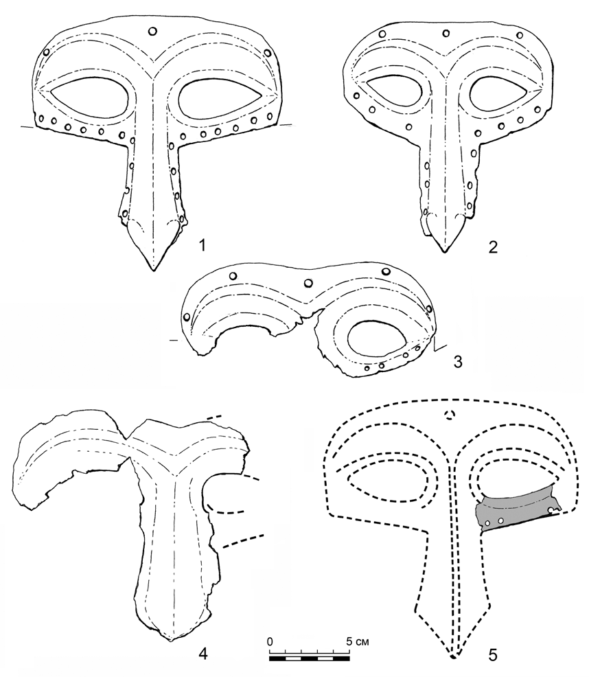 Первая полумаска вместе со шлемом была обнаружена в 1866 г. при невыясненных обстоятельствах близ с. Никольского бывшей Богодуховской волости Орловского уезда Орловской губернии (в настоящее время с. Никольское, Свердловский район, Орловская обл., Россия) (Ленц 1902: 91; Кирпичников 1958: 65). Полумаска по конструкции аналогична публикуемой, но имеет более узкие нос и нижние дуги, формирующие смотровые щели (рис. 4: 1). Размеры: высота 16 см, ширина 16 см. Миндалевидные смотровые щели высотой 2 см и шириной 5 см. С обеих сторон наносника и по низу обоих дуг, формирующих смотровые щели, пробито двадцать (по десять с каждой стороны) отверстий для крепления бармицы. На куполе шлема полумаска закреплена пятью заклёпками. Конструктивно купол шлема состоит из трех вертикально ориентированных секторов подтреугольной формы с изогнутыми боковыми образующими. Один сектор располагается в налобной части, два других — в височно-затылочной. Сектора совмещены с наложением, составляющим приблизительно 10 мм. Все они скреплены друг с другом посредством клепки «в потай». Соединительные швы прокованы и зачищены. Поверхность купола шлема граненая, причем очевидно, что проковка вертикальными гранями осуществлялась уже после сборки купола. Гранение представляет собой чередование плоской выступающей грани и двух разделенных подтреугольным в сечении ребром углубленных канелюр. В нижней части в 2 см от края шлема грани сходят на нет. Здесь же проходит и граница золотого покрытия шлема. На нижней части шлема, оставшейся непокрытой драгоценным металлом, сохранилось восемь фрагментированных и одна целая петля для креп ления бармицы. Вверху купола шлема расположено отверстие около 10 мм в диаметре для монтировки навершия. Высота купола шлема 20,5 см, диаметр 23 см. Весь шлем, включая полумаску, покрыт позолотой, нанесенной посредством амальгамирования5.