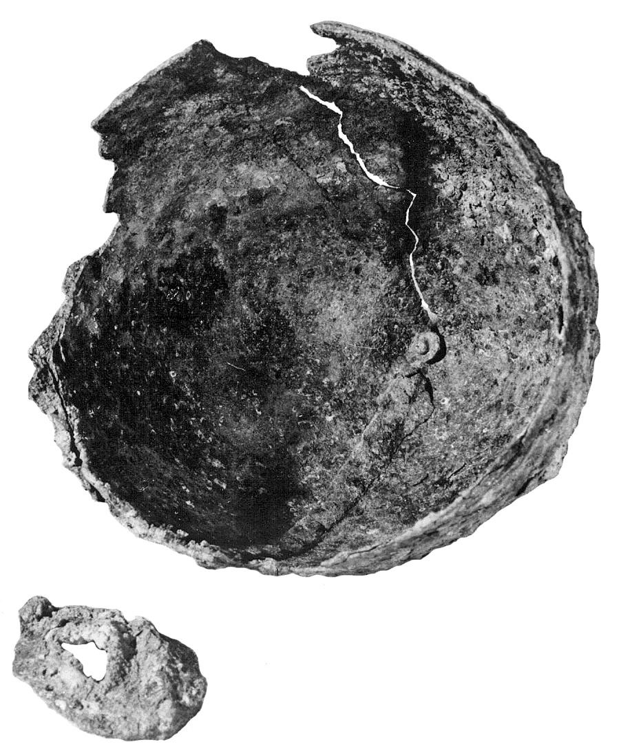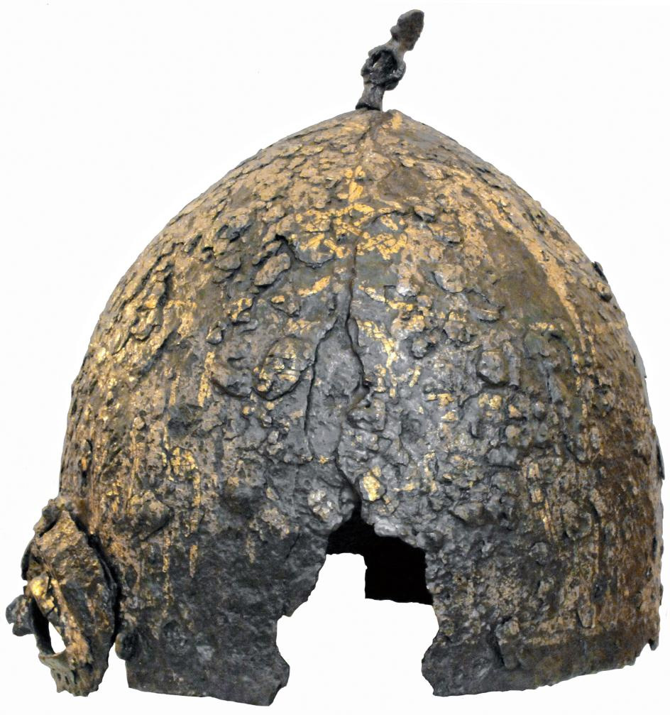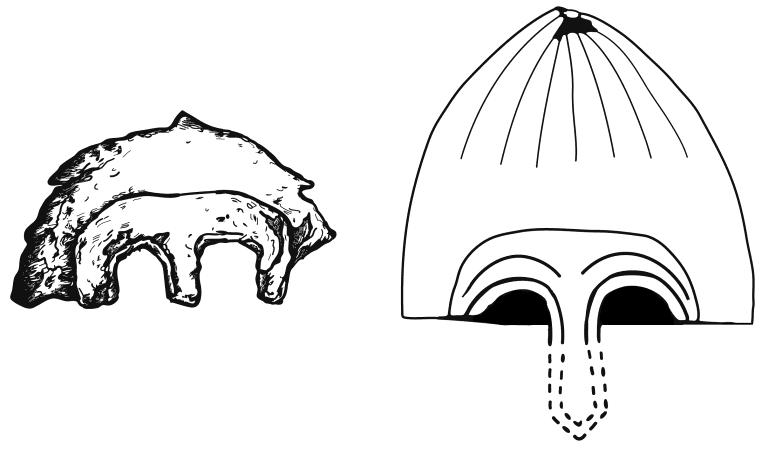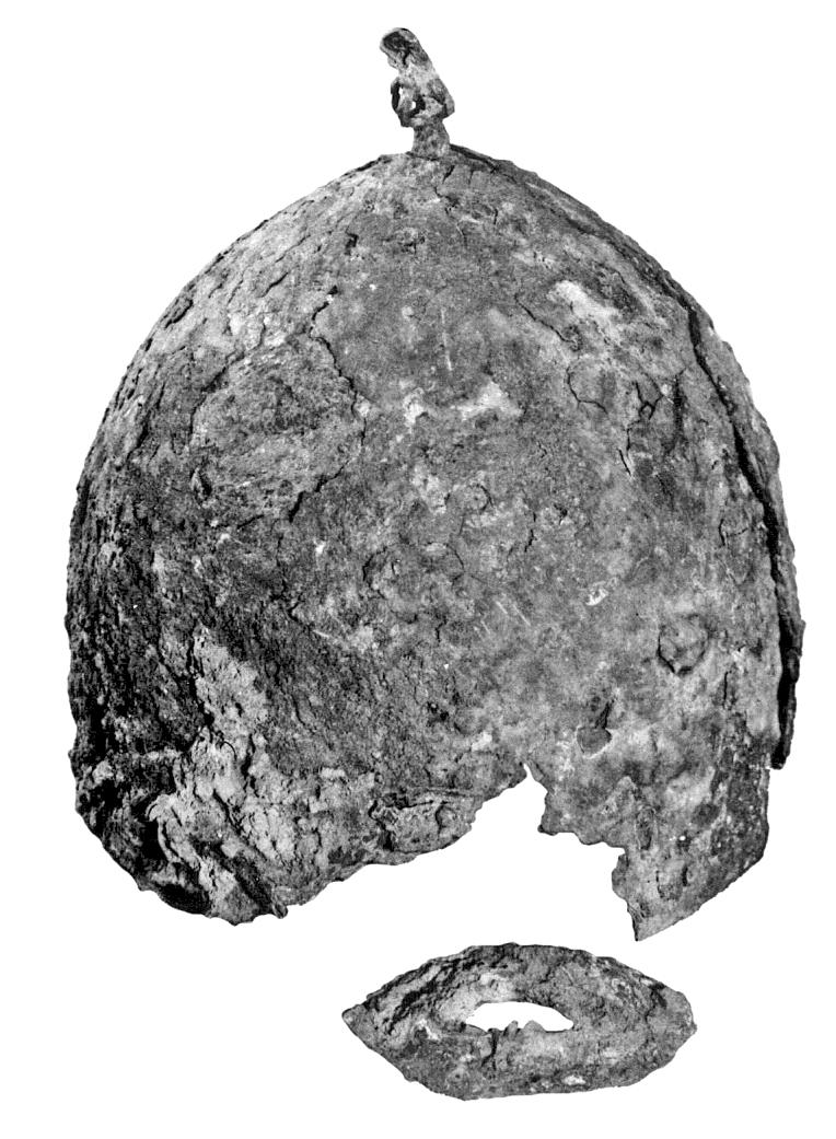 10. Шлем из грунтового захоронения № 1 Келийского могильника в Назрановском районе Республики Ингушетия был обнаружен в ходе раскопок 1987 г., проводившихся под руководством М.Б. Мужухоева65. Экземпляр имел большие утраты и был собран из отдельных фрагментов. Купол наголовья похож на экземпляры крутобоко-куполовидной серии, однако в целом шлем от них отличается своими конструктивными особенностями. Он состоит из куполообразной верхней части и широкого околыша. Кроме того, на шлеме нет скульптурно оформленного наносника. Тут его можно охарактеризовать как упрощенный и редуцированный. Вследствие этого данное боевое наголовье можно считать дериватом местного происхождения, подражающим экземплярам рассматриваемой группы шлемов (рис. 42).