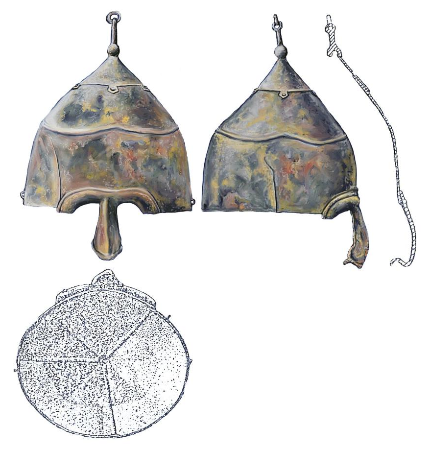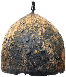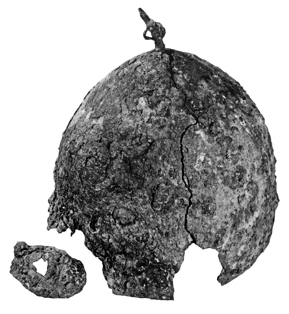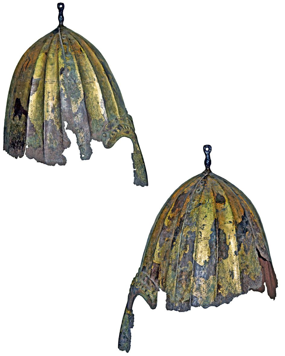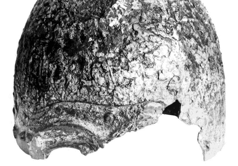 10. Шлем из грунтового захоронения № 1 Келийского могильника в Назрановском районе Республики Ингушетия был обнаружен в ходе раскопок 1987 г., проводившихся под руководством М.Б. Мужухоева65. Экземпляр имел большие утраты и был собран из отдельных фрагментов. Купол наголовья похож на экземпляры крутобоко-куполовидной серии, однако в целом шлем от них отличается своими конструктивными особенностями. Он состоит из куполообразной верхней части и широкого околыша. Кроме того, на шлеме нет скульптурно оформленного наносника. Тут его можно охарактеризовать как упрощенный и редуцированный. Вследствие этого данное боевое наголовье можно считать дериватом местного происхождения, подражающим экземплярам рассматриваемой группы шлемов (рис. 42).
