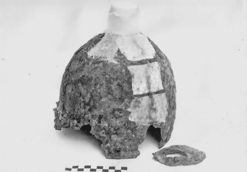Унылым дождливым днем, когда невозможно было проводить раскопки, но студентов, работавших на археологических раскопках, необходимо было чем-то занять, руководителю экспедиции Татьяне Владимировне Гусевой пришла в голову интересная мысль. Пусть практиканты не бездельничают, а пройдут по частным домам городчан и поспрашивают, не находили ли они на своих приусадебных участках какие-либо интересные старинные предметы19. Вскоре студенты прибежали с поразительным известием — один из местных жителей показал им древний шлем, хранящийся у него в сарае. Практически сразу удалось договориться о передаче находки археологам. Впоследствии, уже в 1987 г., шлем был передан Т.В. Гусевой в Городецкий краеведческий музей вместе с остальной археологической коллекцией. Шлем был выставлен в экспозиции, но в музейный фонд вписан не был, ибо было неясно, рассыплется он по ветхости или нет...