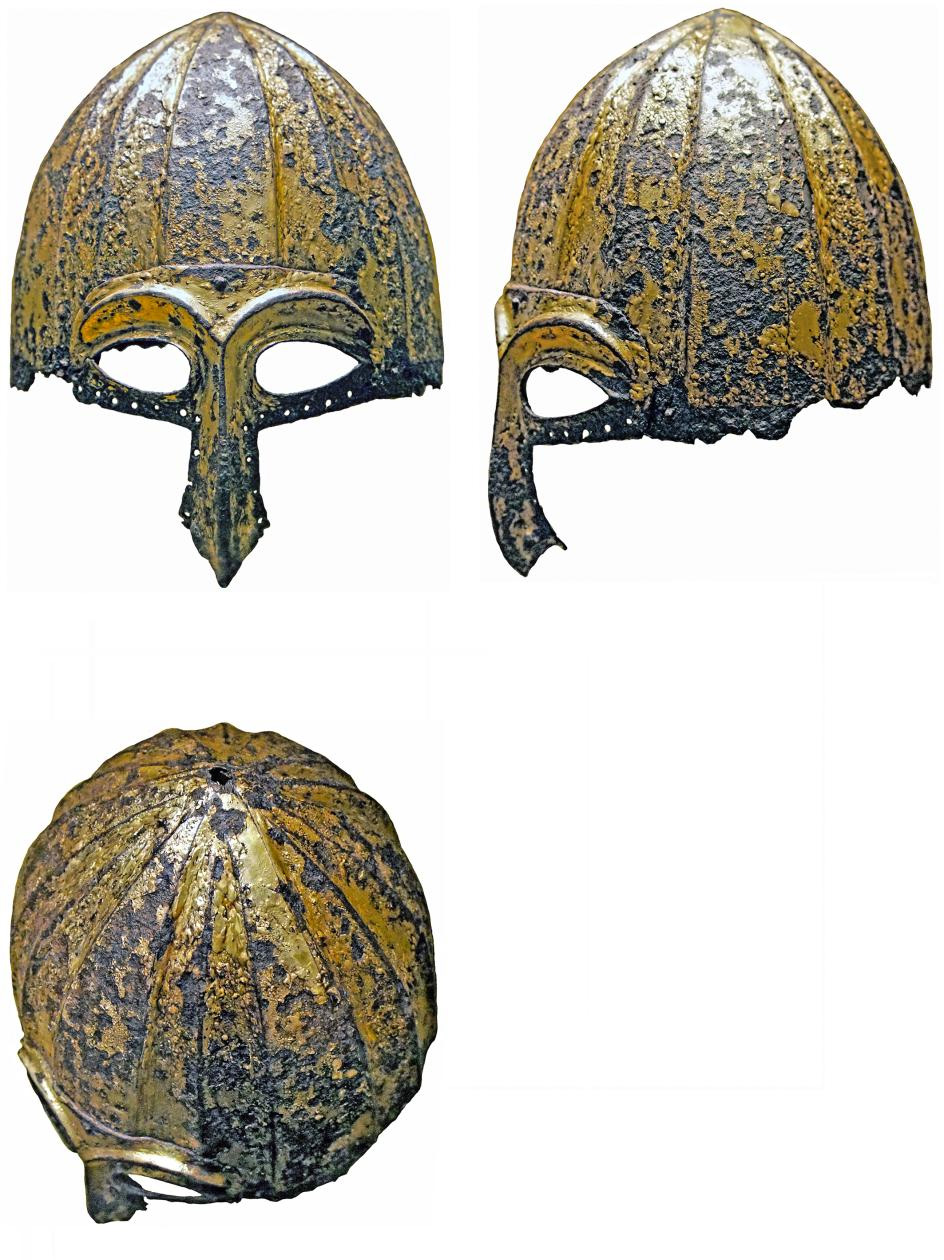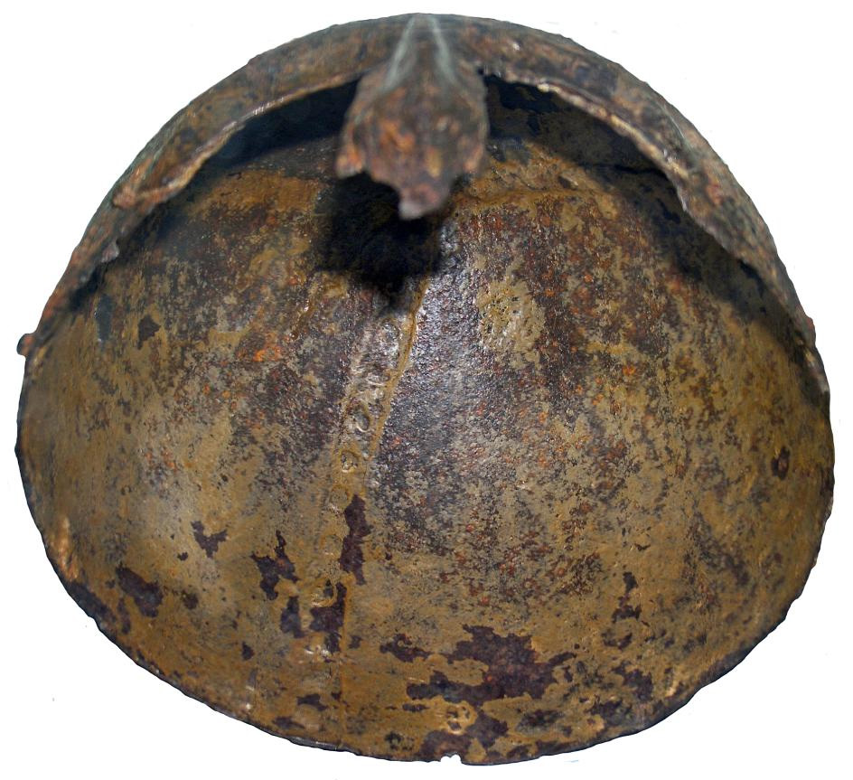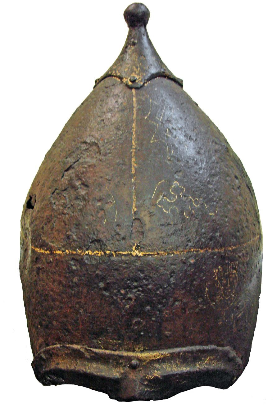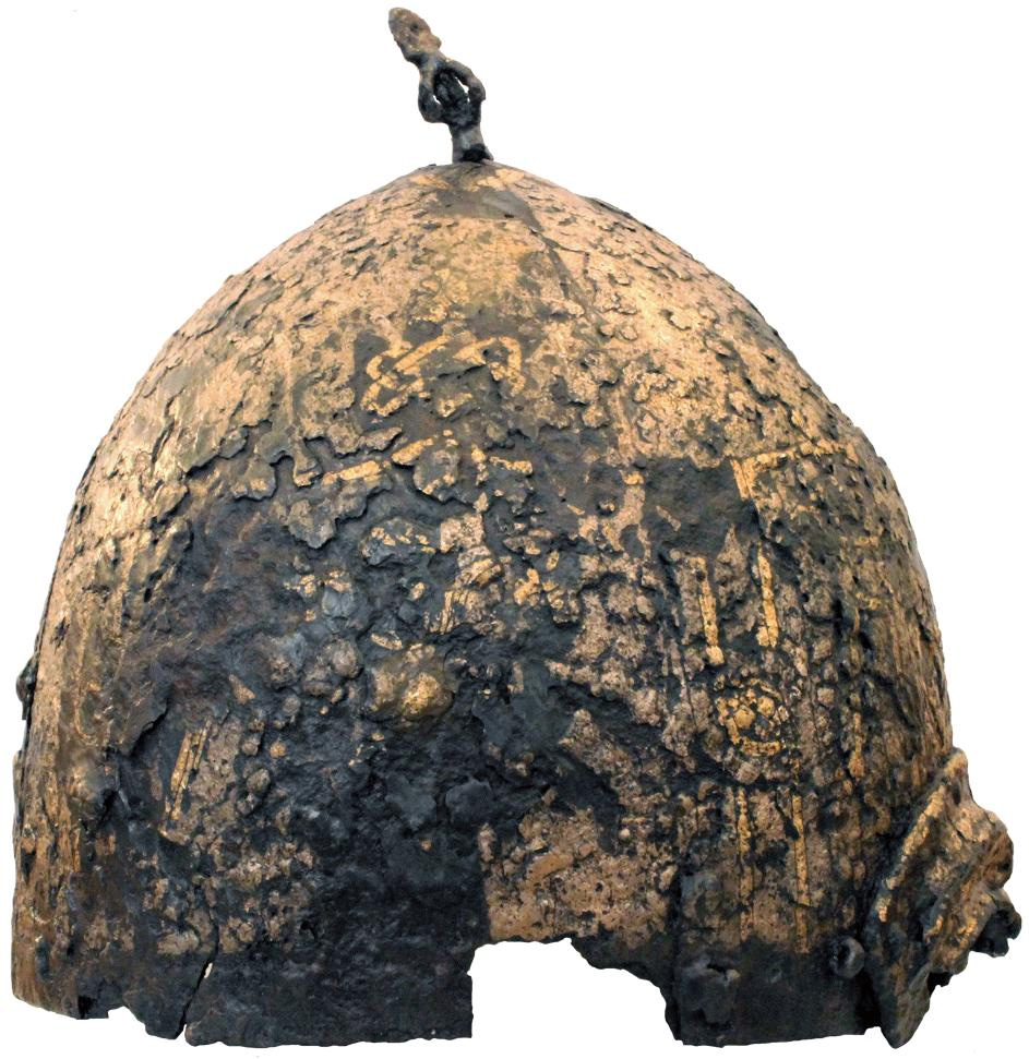 5. Шлем из Краснодарского края. Случайная находка в Прикубанье. На тулье сохранились остатки позолоты. Навершие в виде низенького шпенька, раскованного наверху в колечко, в которое должно было вставляться другое, подвижное и большего диаметра, для привязывания ленты, свисающей двумя концами. Купол шлема рифленый. У этого экземпляра в конструкции имеются определенные отличия от аналогов. Если снаружи тульи шлемов из Никольского и Моску ряд заклепок еле заметен, то здесь на сохранившемся правом боку присутствует накладная вертикальная полоса с выпуклыми кантами, усеянная рядом заклепок. Той же выпуклой линией на налобной части тульи вычеканена заостренная арка, внутри которой той же линией прочеканены крутые «брови» — все это рассечено по оси вертикальной линией от макушки до «бровей — носа». Шлем находится в частной коллекции60 (рис. 37).