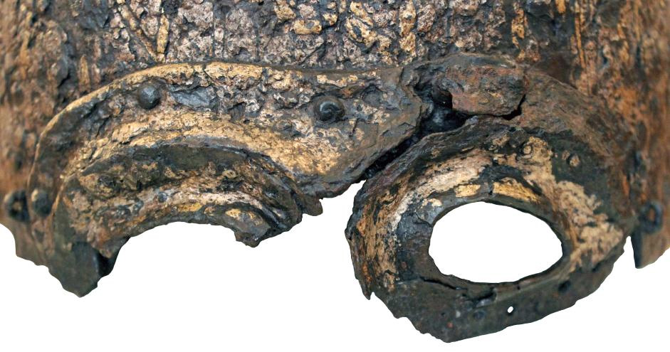 | Рис. 42. Шлем из Келийского могильника, погребение № 1 (рисунок А.Е. Негина по: Виноградов, Нарожный, 1994) | Рис. 43. Полумаска из Вщижа. Фото до расчистки |