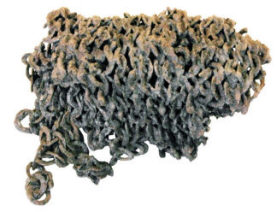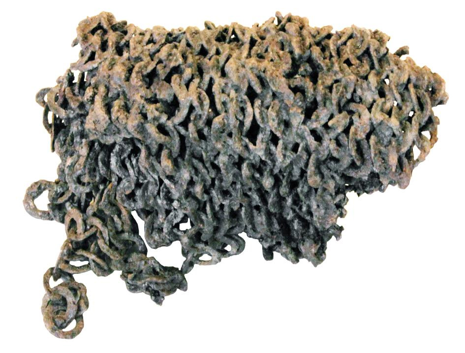 Далее последовала механическая и химическая расчистка поверхности шлема и фрагмента кольчуги и отдельных ее колец с использованием шабера, абразива, щетинной кисти и динатриевой соли (Трилон «Б»).