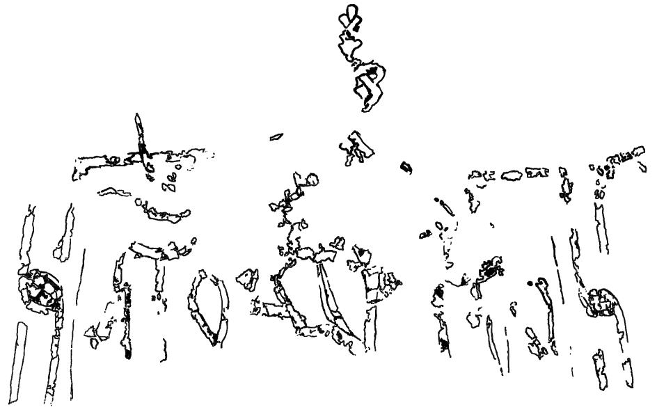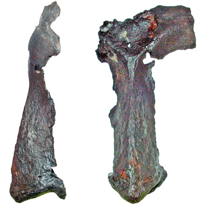 6. Фрагменты полумаски и шлема с городища Свислочь на окраине одноименной деревни в Осиповичском районе Могилевской области Республики Беларусь61. Раскопки В.И. Кошмана, 2006 г. Полумаска была выкована из железной пластины толщиной 0,4-0,5 см. Высота — 13,3 см, ширина сохранившейся части — 14, 7 см, а первоначальный ее размер достигал 19,5 см. Полумаска имела дужки под глазами, соединявшие наносник с надбровными дужками. Купол шлема представлен шестью сильно разрушенными коррозией фрагментами, но можно утверждать, что поверхность шлема была не рифленой, а гладкой. В отличие от других наголовий описываемого типа, купол и полумаска не имели покрытия драгоценными металлами, так как следов такового покрытия полумаски спектральный анализ не выявил. Вместе с тем необходимо учитывать то, что фрагменты очень сильно коррозированы и побывали в сильном пожаре. Огонь мог уничтожить драгоценное покрытие, а в дальнейшем коррозия могла разъесть следы его нанесения, к примеру плакировочную сетку (рис. 38).