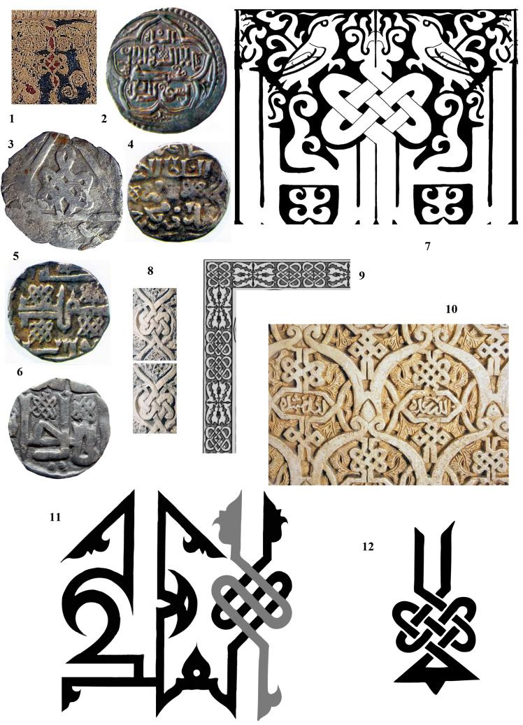 Происхождение «узла счастья» иногда связывают с тибетским буддистским «узлом бесконечности» – символом удачи, идеи бесконечности жизни и реинкарнации, хотя, очевидно, подобный узел в Тибете распространяется несколько позже33. Его проникновение в Восточную и даже Западную Европу происходило из Центральной и Восточной Азии через территорию Средней Азии (Туркестан) вместе с мигрировавшими оттуда тюркскими племенами. В XI в. племенная конфедерация огузов во главе с предводителями из рода Сельджукидов захватила весь Иран, Месопотамию и часть Закавказья, Сирию и Египет, где на всем пространстве сельджукского искусства и сформировался декоративный элемент «узел счастья» в том его классическом варианте, который можно видеть на шлеме из Городца.