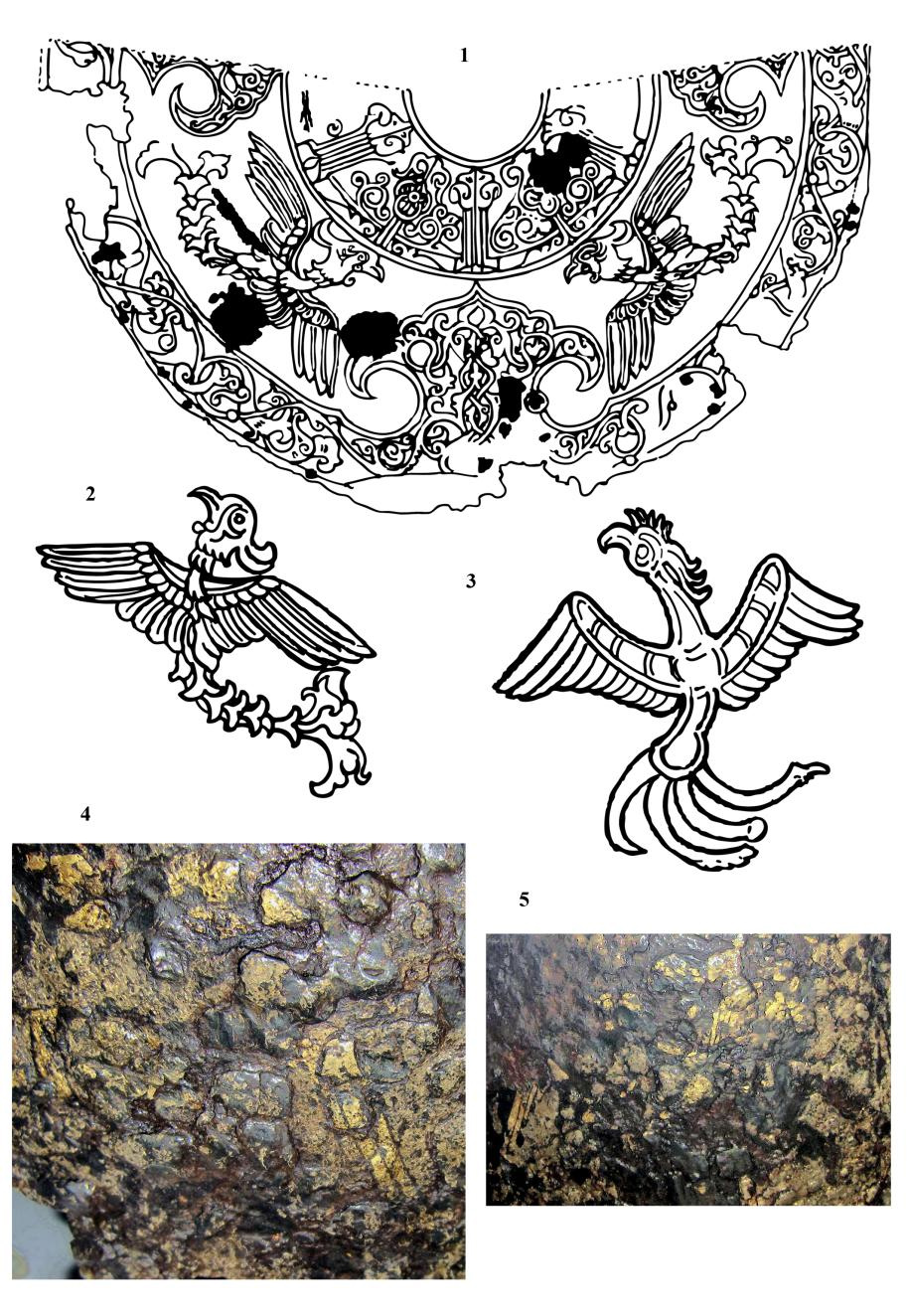Исходя из степени сохранности декора шлема из Городца, сложно определить, изображен ли на нем китайский феникс, либо это, например, Сельджукский двуглавый орел38, поскольку сохранились лишь фрагменты изображения крыльев. Однако следует констатировать, что и при теперешней сохранности декора ясно, что перед нами уникальное произведение оружейного искусства, аналогов которому в пределах серии аналогичных боевых наголовий не имеется (рис. 29).