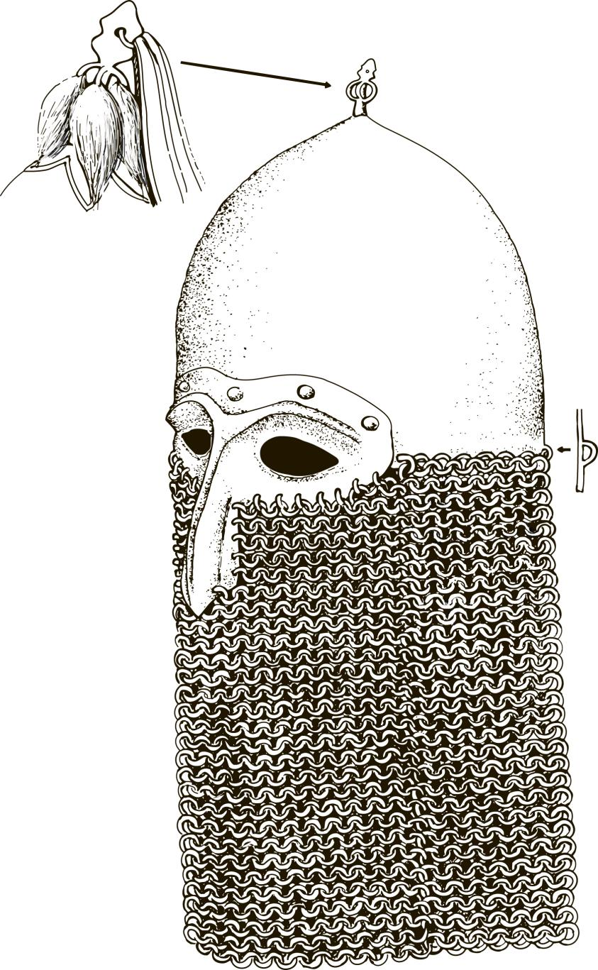 Все вышеперечисленные шлемы практически аналогичны. Их характерными признаками являются: крутобокая тулья, навершие в виде стерженька, который почти во всех случаях немного отогнут назад. На стерженьке кольцо для крепления украшения в виде двух кожаных или матерчатых ленточек. По нижнему краю тульи размещены петли для обруча, к которому привешивалась тыльная часть бармицы, а лицевая ее часть крепилась к полумаске. На некоторых шлемах окологлазные выкружки, вероятно, были преднамеренно удалены, чтобы получился наносник (Лыково, Моску). Аналогичным образом, окологлазные выкружки на шлеме из Киева также, скорее всего, были удалены масте-ром-оружейником вскоре после изготовления шлема. Таким образом, полумаски трансформировались в наносник, к которому крепилась лицевая часть бармицы. Для крутобоких шлемов характерна дорогая отделка в виде оковки серебряным листом и последующего золочения.