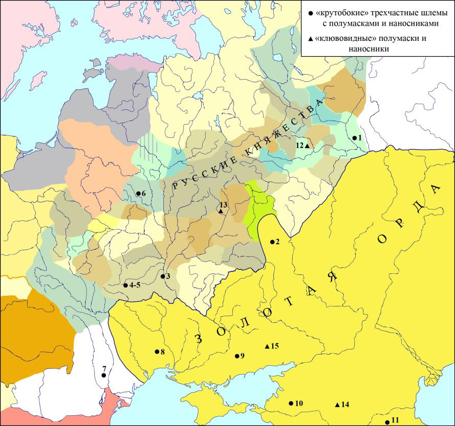 Находка дополняет серию крутобоко-куполовидных боевых наголовий, судя по иконографическим данным Ирана первой трети XIV в. и археологическим находкам, широко распространенным на территории Восточной Европы в XIII и в начале XIV в. Три из них: из села Лыково (Владимирская область)39, Киева (Украина)40 и Городца (Нижегородская область) найдены непосредственно на древнерусской территории (рис. 29). Кроме того, имеются остатки полумасок, принадлежавших к шлемам этого же типа, из раскопок в Изяславле (с. Городище в Шепетовском районе Хмельницкой области, Украина)41, Вщиже (ныне одноименное село в Жуковском районе Брянской области)42 и на городище Свислочь (Осиповичский район Могилевской области Республики Беларусь)43. Остальные известные нам крутобоко-куполо-видные шлемы и их фрагменты происходят с ордынской территории и из кочевнических погребений: Чингул (с. Заможное Токмакского района Запорожской области, Украина)44, Моску (Тыргу Бужор, Румыния)45, Таборовка (Николаевская область, Украина)46, случайная находка у с. Никольское (Орловская область)47, случайная находка из погребения в Краснодарском крае48, остатки наносника или полумаски из погребения у поселка Семеновод (Новоалександровский район Ставропольского края)49, случайно найденная полумаска из Донецкой области (Украина) и, возможно, шлем из погребения под Ногайском (современный город Приморск, Запорожская область, Украина)50 (рис. 30).