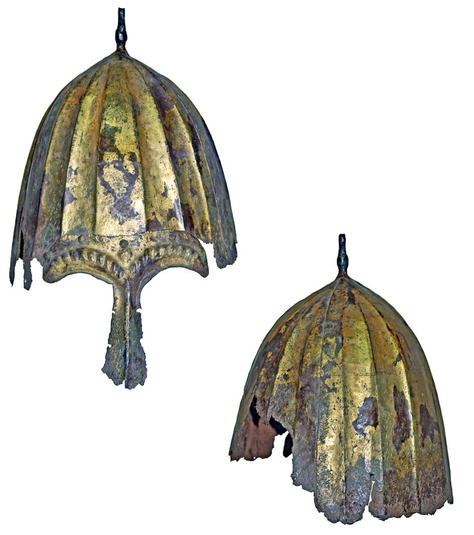Шлем собран из трех пластин (большой лобной и двух тыльных) методом ковки и кузнечной сварки, наверху шлема видны швы от сборки. Высота шлема — 215 мм, диаметр — 240 мм (рис. 12-17). К куполу пятью заклепками приклепана небольшая полумаска, состоящая из окологлазных выкружек и обломка клювовидного наносника. По словам нашедшего, в момент находки полумаска была совершенно целой, но рассыпалась, прежде чем шлем был передан в музей. Под бровями полумаски видны остатки мелких декоративных (?) заклепок; сохранились пять шляпок под одной и две шляпки под другой бровью. Полумаска была полностью посеребрена, но по верхней кромке, а также на бровях, веках и на носу прослеживаются остатки позолоты. По нижнему краю полумаски проделаны отверстия для крепления лицевой части бармицы (расчищено четыре отверстия). Интересно навершие шлема, напоминающее по своей конструкции наконечник зажигательной стрелы: с отходящими от стержня четырьмя крестообразно расположенными ушками, предназначавшимися для крепления на них украшения — плюмажа из конского волоса (рис. 19). Над ушками стержень значительно расширяется, образуя листовидный наконечник с отверстием в центре для крепления кольца с привязанными к нему двумя матерчатыми или кожаными ленточками (судя по многочисленным изображениям подобных наверший на рисунках в восточных манускриптах). Стержень навершия не только несколько отогнут назад, но еще и немного изогнут книзу. Он был позолочен, о чем свидетельствуют остатки позолоты на его ушках. Купол шлема, так же как и полумаска, покрыт относительно толстым слоем серебрения, с линиями гравировки по серебру, почему-то не украшенными позолотой в нескольких местах. Сам орнамент на шлеме представляет собой четырехчастную композицию, свойственную некоторым восточноевропейским шлемам. Подобное орнаментальное оформление тульи золоченых шлемов можно видеть на миниатюрах из «Большой Шах-наме»21. Такое же орнаментальное деление тульи присутствует и на шлемах из Таборовки22 и Таганчи23 (территория современной Украины) (рис. 21), Ватра-Молдовичей (курган «Хургишца») в Румынии24 (рис. 22), где линии гравировки имитируют широкий околыш и стыки пластин сегментного шлема. Присутствует и четырехлепестковое подвершие или его орнаментальная имитация. Все вышеперечисленные признаки М.В. Горелик относит к классическим монгольским шлемам, изготовленным из нескольких соединенных клепкой сегментов, места стыков которых перекрывались выпуклыми узкими вертикальными пластинами-ребрами25. Снизу же данные пластины были стянуты различной высоты околышем, а сверху четырехлепестковым подвершием. Поскольку на шлемах из Городца, Таборовки, Таганчи и Ватра все эти детали переданы лишь орнаментальной имитацией в виде золоченого декора (Городец, Таганча) или зубчатой гравировки, как на шлеме из Таборовки, логично предположить, что это локальные подражания, распространенные на территории Ак Орды, лишь чисто внешне воспроизводящие образцы монгольской оружейной традиции26.