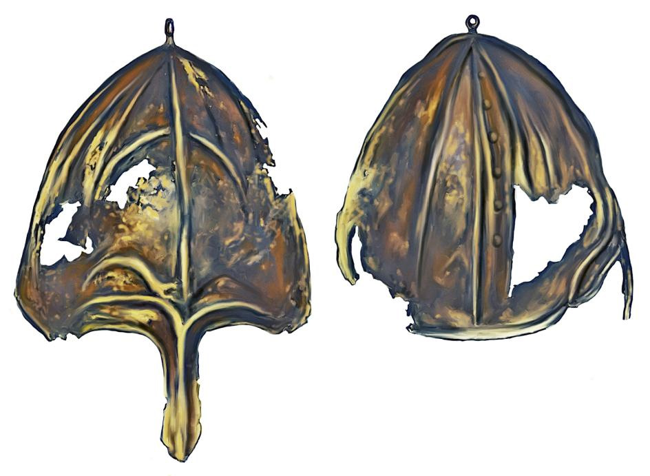 Наиболее интересным элементом орнаментального украшения купола шлема представляются сильно фрагментированные изображения крыльев, располагающиеся в боковых и затылочном секторах орнаментальной ленты. Вследствие этого, с некоторой степенью осторожности, можно предполагать изображение на шлеме птиц в «геральдической» позе с развернутыми крыльями.