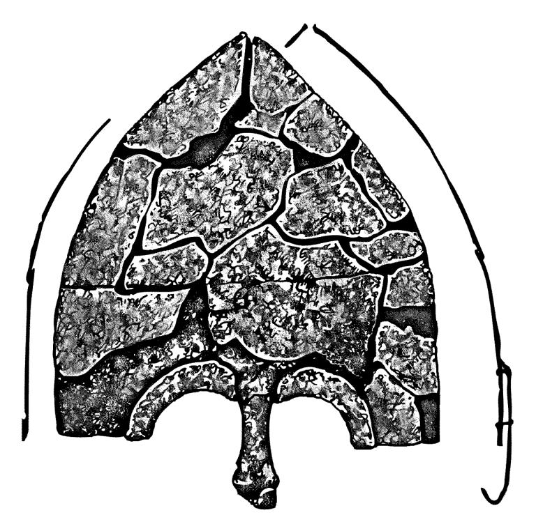 8. Шлем из раскопок В.Н. Фоменко, 1982 г., на Нижнем Днепре, у с. Таборовка Николаевской области, Украина. Впускное погребение № 5 в кургане № 1, известном в народе под названием «Приверха могила». Инвентарь, в том числе полная туша коня и распрямленная витая гривна, свидетельствует о том, что покойный был золотоордынским воином половецкого происхождения63. Купол шлема имеет аналогичное с городецким шлемом оформление, выполненное на сей раз гравировкой, которая делит тулью на две неравные по высоте части: зубчатой линией показана фальшивая идеальная «структура» шлема — околыш в виде зубчатого венца и купол из их секторов. На тулье шлема сохранились остатки толстого слоя позолоты, некогда покрывавшей его. Кроме того, присутствует и круговая бармица, подвешенная на пруте. Общая высота — от борта до верхушки шпиля — 18,5 см, диаметр тульи у борта — 25,5 см. Корпус шлема сварен из трех железных секторов толщиной около 3 мм (рис. 40).