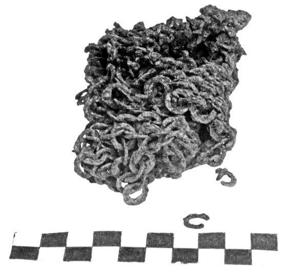 Иногда древняя окутанная легендами земля расстается со своими сокровищами, которые скрывала долгие столетия. Случилось так и в жаркий летний день 1985 г., когда жители улицы Загородной — Алексей Матвеевич и Борис Алексеевич Мошкины — рыли яму в своем огороде. Неожиданно лопата наткнулась на что-то твердое. Нашедшие не сразу поняли, с чем имеют дело, подумав, что выкопали из земли заляпанный грязью старый рукомойник. Только после того, как на поверхности показалась свернутая комом кольчуга и россыпь наконечников стрел, стало понятно, что найден древний доспех. Но ужасающая сохранность предметов нисколько не впечатлила нашедших. Кольчуга представляла собой большой спекшийся ком, от которого лопатой был отколот кусок, а остальное было выброшено за ненадобностью и потеряно для науки. При дальнейшем осмотре и раскопках костяка выявлено не было, а следовательно, находка не связана с захоронением. Само место находки располагалось буквально у подножия внутренней стороны крепостного вала, и предметы находились, по словам нашедших, в горелом слое на глубине около полуметра. Найденный предмет оказался настолько бесполезным в хозяйстве, что был без малейшего сожаления отдан соседу.