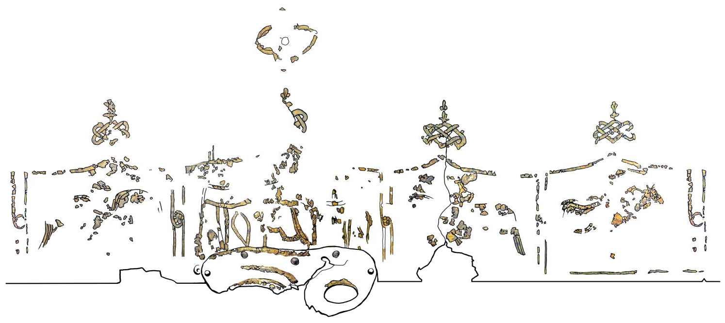 После расчистки от продуктов коррозии появилась возможность рассмотреть остатки орнамента наилучшим образом. Именно тогда было проведено калькирование декора шлема, запечатлевшее его в наиболее точном виде.