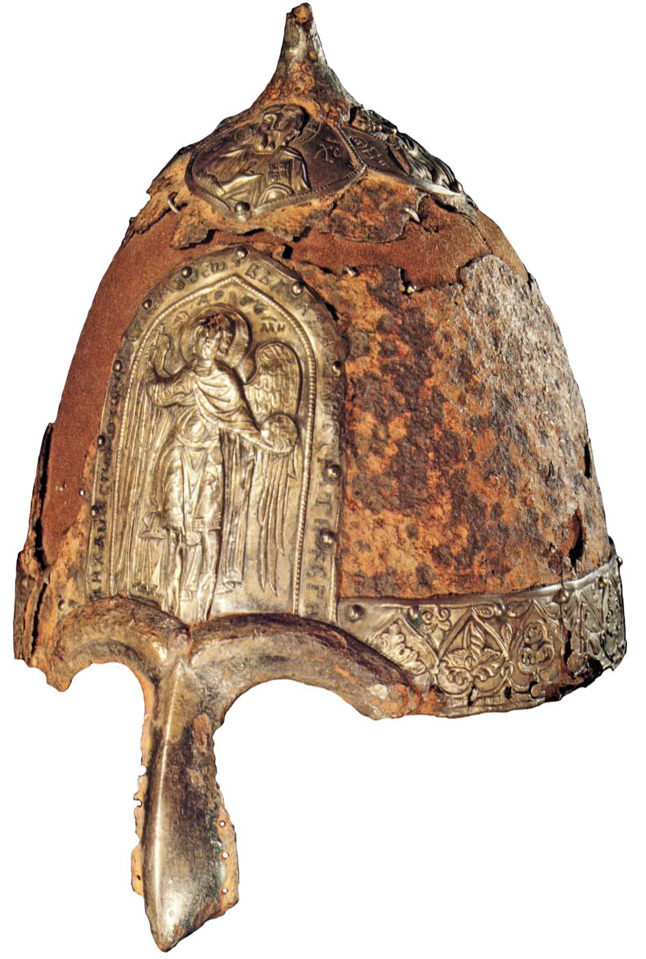 9. Так называемый «шлем Ярослава Всеволодовича», случайно найденный возле с. Лыково у г. Юрьева Польского64. Тулья шлема имеет плохую сохранность, вследствие чего трудно уловить ее первоначальную «геометрию» и судить о том, относится ли он к трехчастным шлемам, так как из скольких частей состоит его купол, нигде не упоминается и этим вопросом никто специально не занимался. Первоначально шлем был покрыт серебряным листом и украшен позолоченными серебряными чеканными накладками. К макушке прикреплено небольшое навершие. На вершине на звездчатых пластинах размещались изображения Спаса, Св. Георгия, Василия, Федора. На челе шлема помещена большая накладная пластина с образом архангела Михаила с черневой посвятительной надписью: «Вьликъи архистратиже ги Михаиле помози рабу своему Феодору». По нижнему краю проходит орнаментная кайма с изображениями грифонов, птиц и барсов, разделенных лилиями и листьями. На кайме ряд дырочек, пробивших орнамент и корпус. Возможно, они служили для крепления подкладки. В дополнение к этому кругом по ободу в пяти местах имеются сломанные ушки для привешивания бармицы на пруте. К тулье приклепан посеребренный наносник, реалистически изображающий горбатый нос. Надбровье наносника позолочено. Следы железной полумаски прослеживаются по обломам нижних выкружек для глаз на обеих сторонах наносника. Общая высота 21,5 см. Высота навершия 3,5 см. Пластинка с Михаилом Архангелом 9×12,5 см. Размер носовой накладки 14×10 см. Наносник выступает за нижний обрез на 7 см. Его ширина в широкой части 3,5 см (рис. 41).