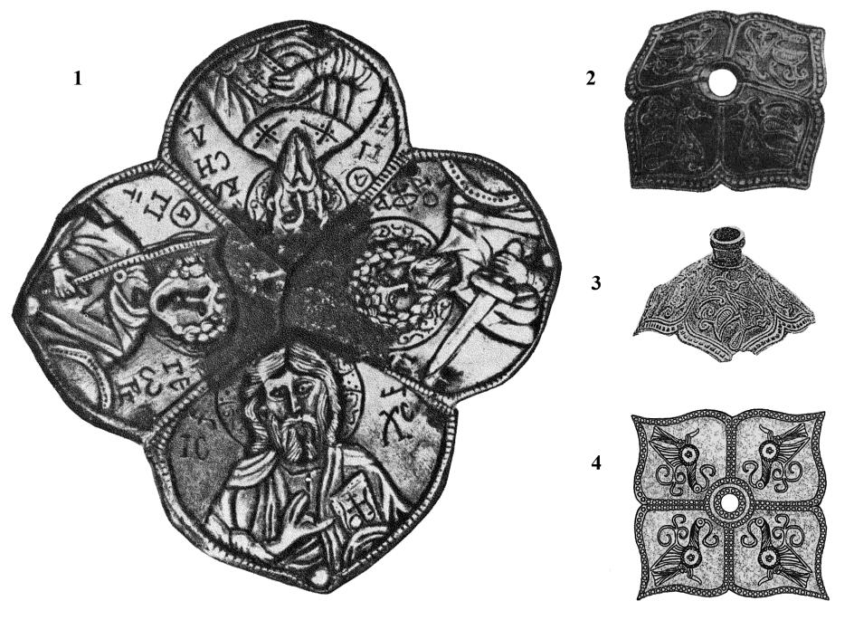 Орнаментация шлема из Городца делит его на два горизонтальных сектора (рис. 23). В верхнем секторе располагается декор на макушке купола, где имеется отверстие и приклепано навершие шлема. Он представляет собой цветок четырехлепестковый; по всей видимости, геральдическую лилию. Лепестки цветка обращены вниз и направлены к «узлам-плетенкам», которые являются частью нижнего сектора декора. Расположение лепестков цветка по сторонам света – это типичная четырехчастная схема распространения блага в четырех направлениях, имевшая символическое значение: обезопасить владельца изделия со всех четырех сторон света27. Такое украшение на макушке шлема можно встретить еще на нескольких сохранившихся экземплярах. Правда, речь идет о накладных металлических пластинках-навершиях из четырех фигурных секторов, украшавших боевые наголовья из позднекочевнических погребений у г. Энгельса в Саратовском Заволжье28, у с. Новотерское в Чечне29 и о навершии шлема с территории золотоордынского города Нового Сарая30. Такие же металлические пластинки с изображением христианских святых, обращенные на четыре стороны света, украшали навершие шлема из села Лыково (Владимирская область)31. Нужно отметить, что традиция изготовления «наверший-розеток» на шлемах появляется гораздо раньше, чем перечисленные образцы боевых наголовий. Нечто очень похожее можно наблюдать на золоченых шлемах типа «Черная могила», относящихся ко второй половине X-XI в.32 (рис. 24).