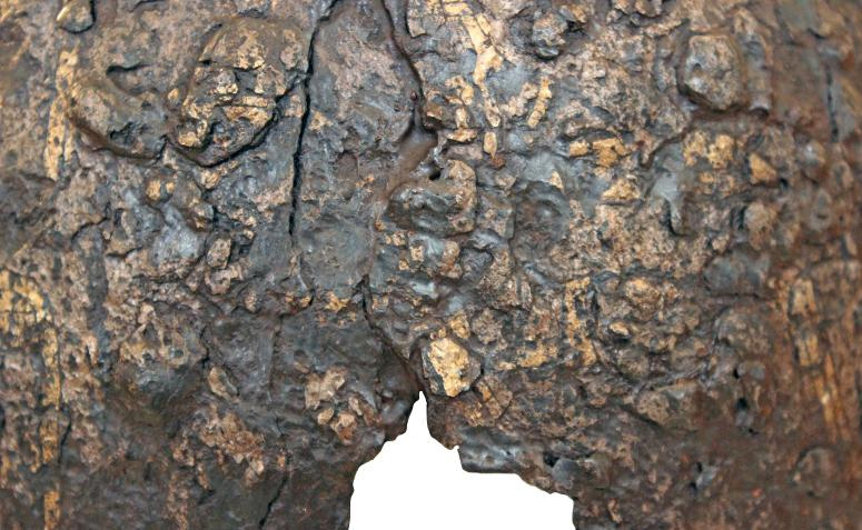 Прежде всего была проведена фотофиксация того состояния, в котором находилось поступившее боевое наголовье. Затем последовало внимательное изучение поверхности с использованием бинокулярной лупы и иглы, необходимое для выявления степени сохранности, толщины слоя продуктов коррозии, наличия активных очагов. На следующем этапе в течение трех суток проводилось размягчение в керосине продуктов коррозии. После этого было проведено обезжиривание поверхности и промывка растворителем № 646. Следующий шаг — промывка, то есть кипячение в дистиллированной воде с добавкой мыла, проводившееся по часу два раза, а также сушка в сушильном шкафу при температуре 100°C на протяжении 30 минут.