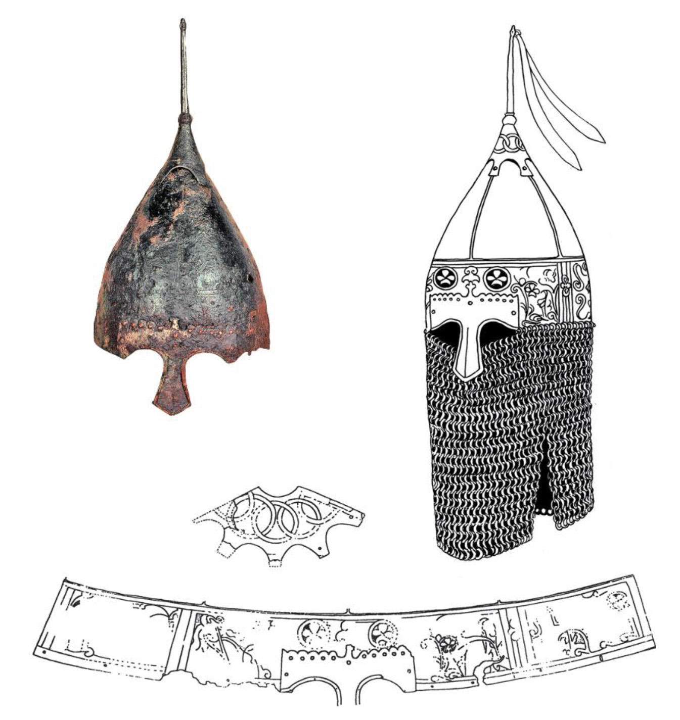 К сожалению, мой очерк «Шлем из Городца: тайны, факты, гипотезы» вышел мизерным тиражом и, что более всего неприемлемо для такой уникальной находки, с черно-белыми иллюстрациями при отсутствии детальных фотографических изображений. Также вскоре стало ясно, что сделанные с натуры в музее прорисовки орнамента шлема не очень точны. После проведенной макросъемки выявились ранее малозаметные детали орнамента, которые были еще в большей степени уточнены благодаря калькированию орнамента шлема, выполненному О.В. Степановым непосредственно после расчистки шлема от продуктов коррозии и перед покрытием наголовья синтетическим лаком. Именно тогда появилась возможность рассмотреть остатки декора наилучшим образом. В связи с этим возникла необходимость издания расширенного исследования с более детальными прорисовками, цветными фотоснимками и более точными сведениями об орнаменте и конструкции шлема из Городца.