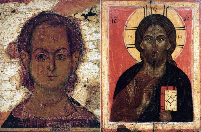 (Рис. 4.1) Иконография Христа: Спас Эммануил. Икона XII в. (фрагмент); / Господь Вседержитель. Новгородская икона XIV в.
