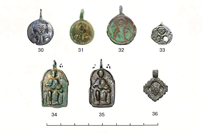 (Табл. III.II.) Иконки с изображением Господа Вседержителя. (30-35) Медный сплав, литье, чернь. Вторая половина XII-первая полови на XIII в. / Иконка с изображением образа Спаса Нерукотворенного. (36) XV-начало XVI в. Оловянистый сплав, литье.