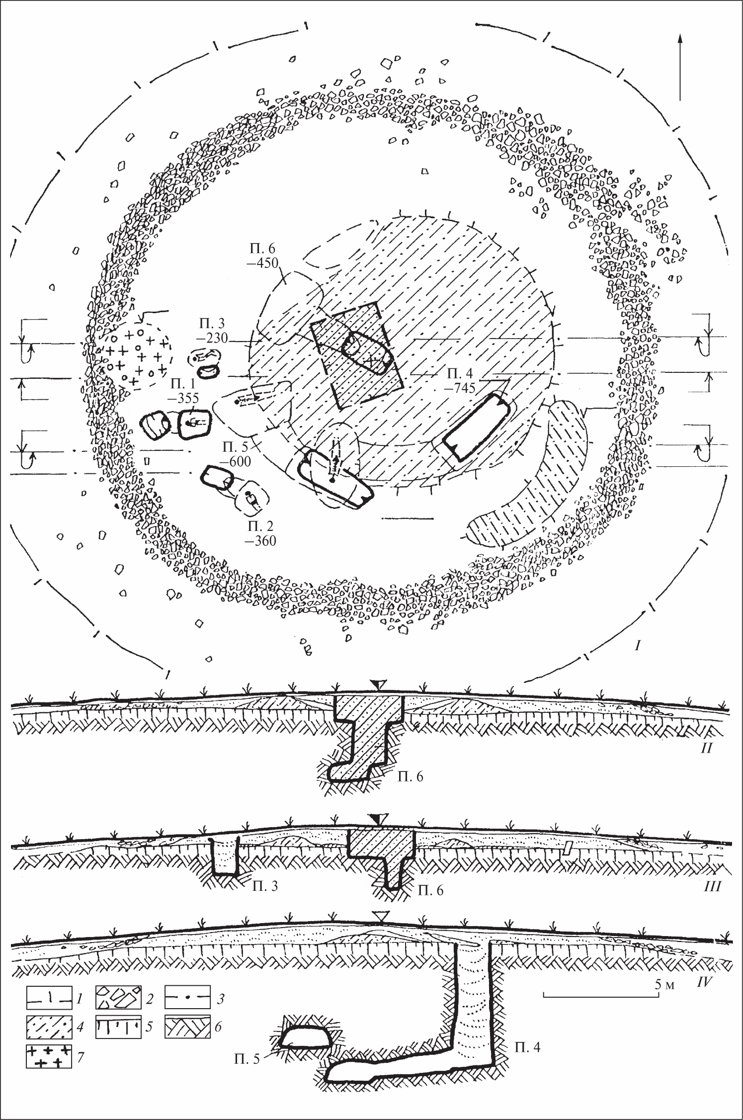 Захоронение 4 (рис. 3, 1-4) устроена в юго-восточном секторе кургана в катакомбе. Прямоугольная в плане входная яма, 3,8×1,4 м, ориентирована северо-восток-юго-запад. Она расширялась до дна на 0,1-0,4 м. Дно ямы от глубины 6,4 м плавно понижалось на 0,15 м к юго-западу – до дромоса. В засыпке ямы найдена придонная часть амфоры (рис. 5, 2). Вход в дромос арочной формы имел высоту 1,0 м при ширине 1,6 м. Перед ним была ступенька высотой 0,2 м. Длина дромоса 3,9 м, ширина 1,6-1,8 м, высота 1,0 м . У северной стены (рис. 4) выявлено придонную часть лепного сосуда – жаровню с пеплом (1) и два наконечника стрел (2). У входа в камеру стоял бронзовый котел (3) с костями барана и железным стержнем (4).