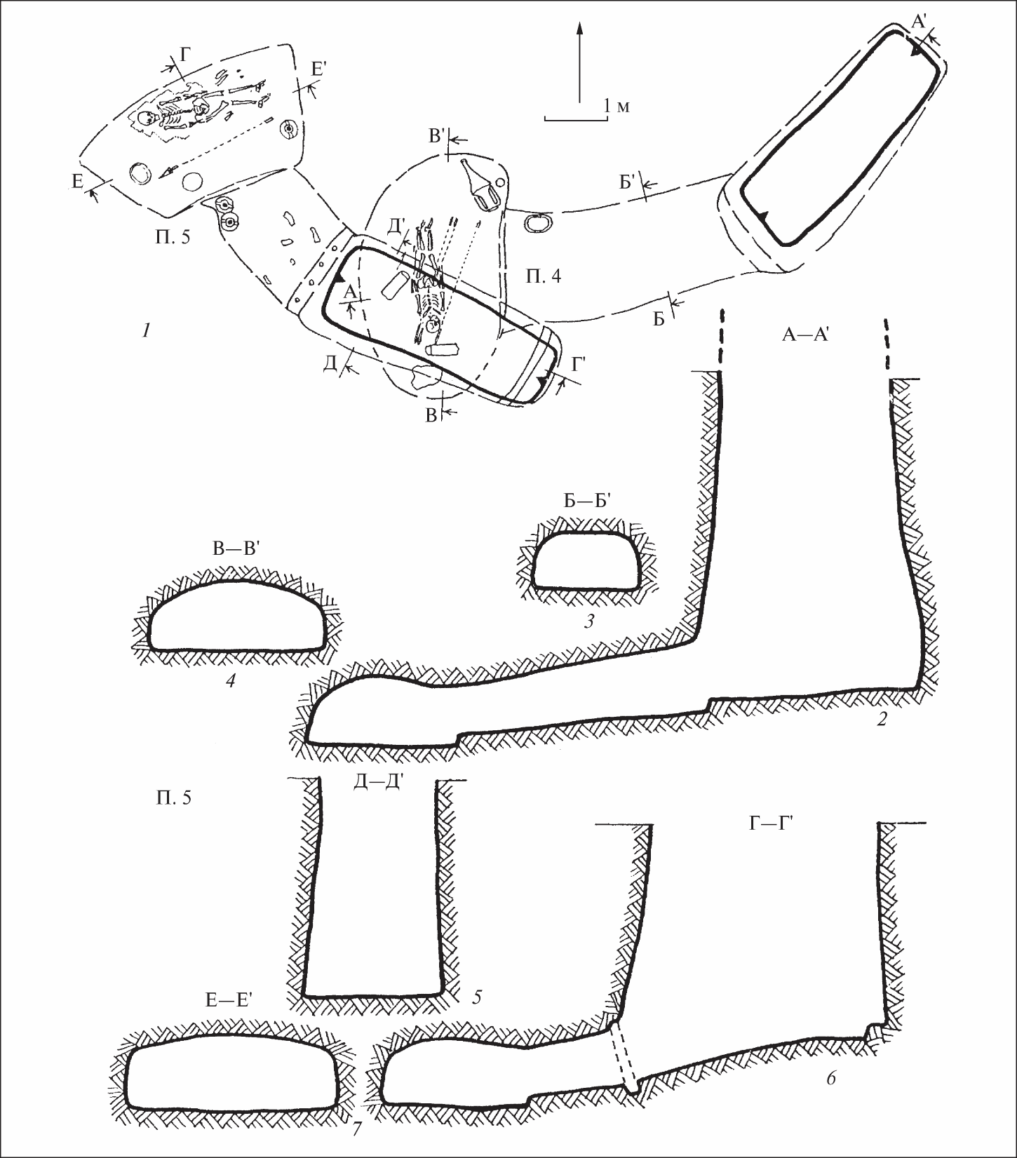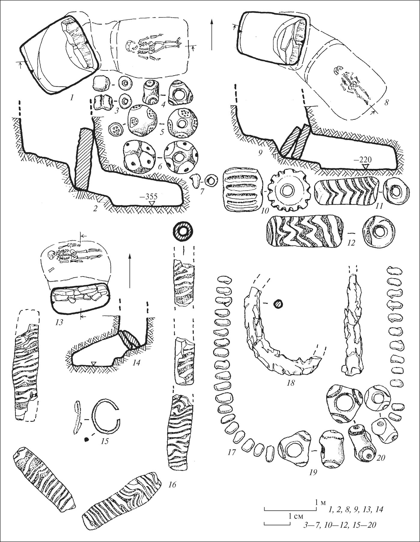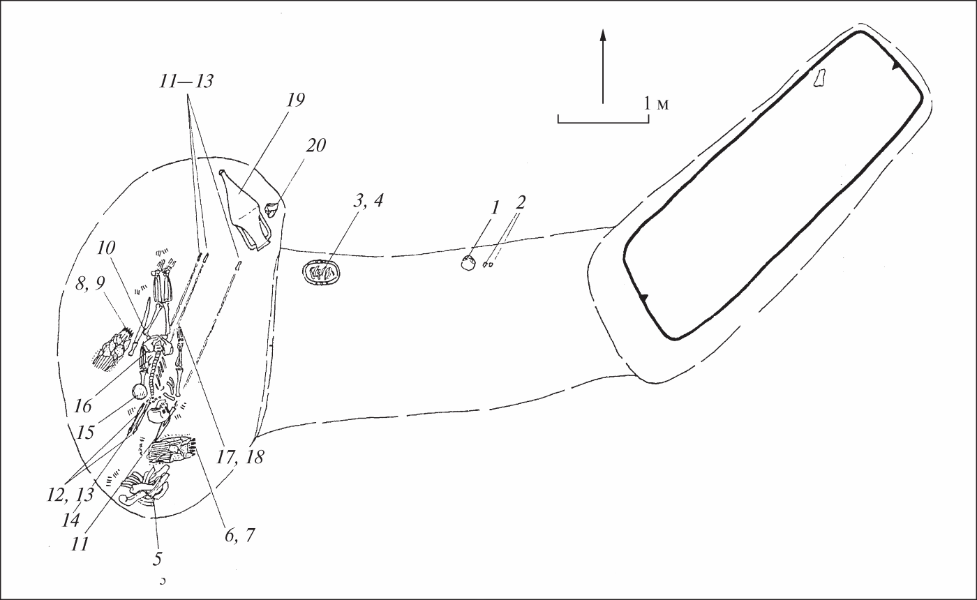 Захоронение 1 (рис. 2, 1, 2) размещалось в западной части кургана и было совершено в катакомбе. Квадратная в плане входная яма, 1,4×1,4 м, ориентирована углами по сторонам света. На глубине 2,4 м вдоль западной стены была ступенька шириной 0,3 м; еще одна, шириной 0,6 м – на глубине 0,4 м, а третья, шириной 0,8 м – на глубине 3,25 м. Вход в камеру (высота 0,6 м, ширина 1,0 м, длина 0,3 м) был выкопан в восточной стене ямы и закрыт каменной плитой. Прямоугольная в плане захоронения камера, 1,5×1,2 м, высота 0,6 м, направленная к центру кургана. Ее глубина 3,55 м, на 0,30 м ниже дна дромоса. Костяк ребенка 12 лет лежал вытянутая на спине головой на запад – к выходу. В области шеи зафиксировано скопление бусин.