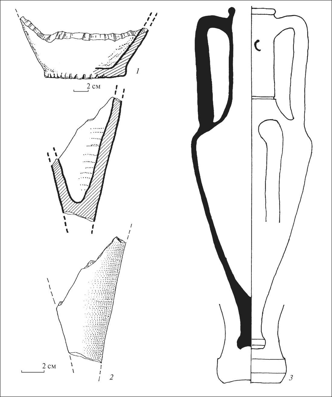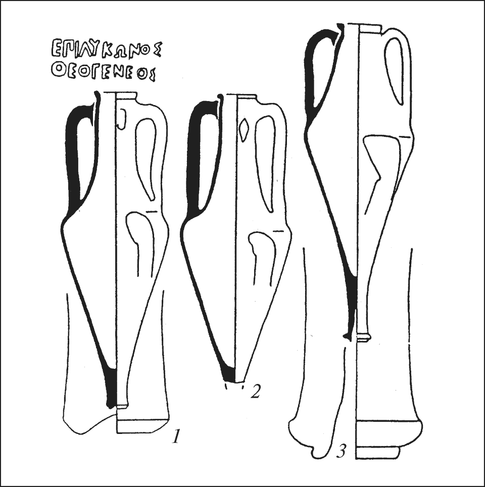 1-3. С.Ю. Монахов исследовал амфоры по захоронению (Монахов 1999, с. 309-311, табл. 132; 2003, с. 83, 133, 134, табл. 57, 1; 92, 7). Две - однотипные Гераклейского амфоры (вариант I-А-3), в одной ножка отражена (рис. 14, 1, 3). На горловине одной есть клеймо ЕПIΛКΩΝΟΣ / ΘΕΟΓΕΝΕΟΣ, на горле другой ромбический штамп, на котором С.Ю. Монахов разобрал только имя Агнодама. Подобный вариант использовался в 370-х-360-х гг. до н. э. Еще одну амфору «круги Фасоса» с биконическим туловищем на длинной ножке (рис. 14, 2) С.Ю. Монахов предложил обозначать как «псевдо-Фасос-6», или «тип Лепетиха». В целом комплекс амфор по захоронению 5 он датировал серединой 60-х гг. IV в. до н. э.