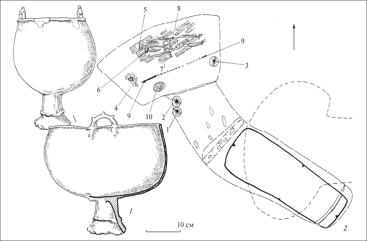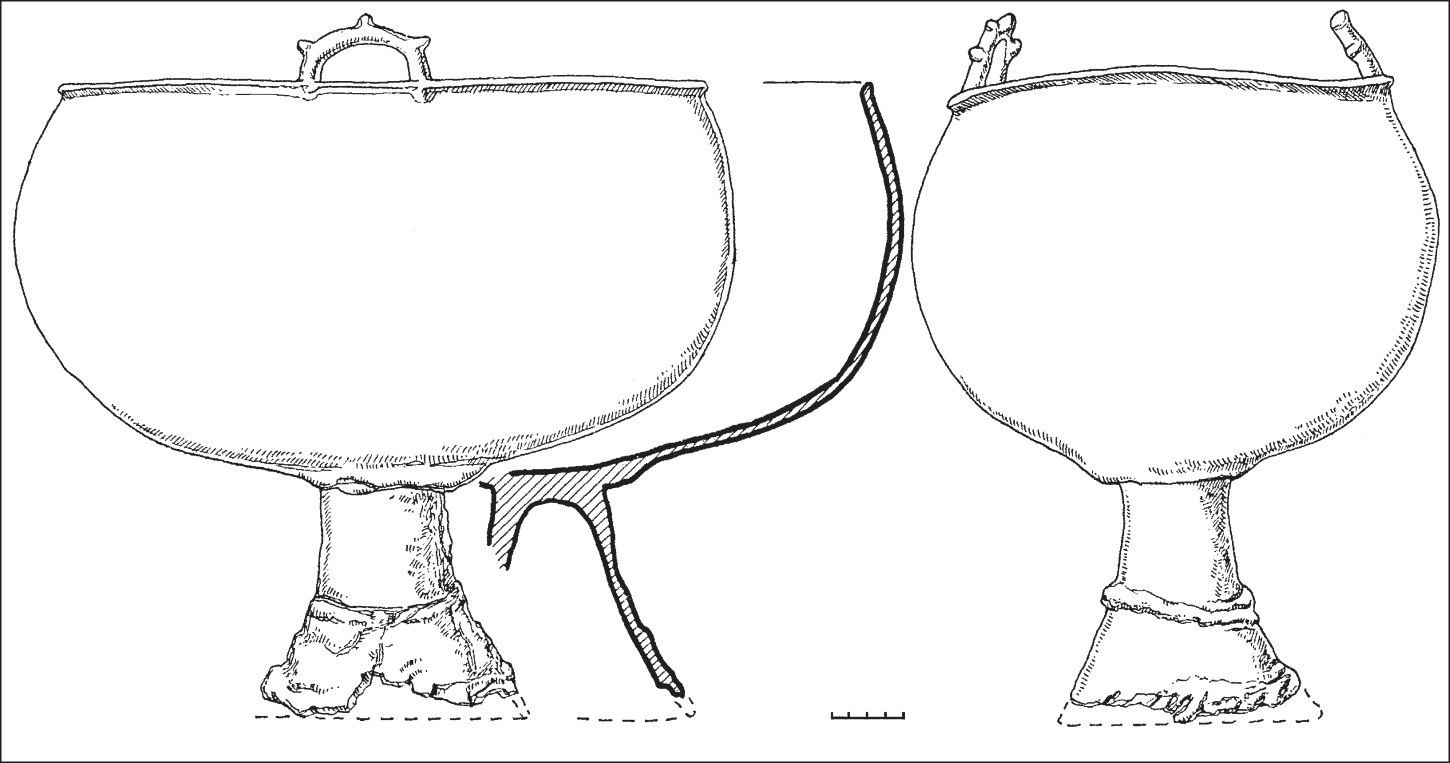 10. Котел литой бронзовый, близкий к найденному в могиле 4. Он имеет глубокую овальную чашу с бортиком по краю, где симметрично расположены две ручки с тремя выступами. Ножка пустотелая, с рельефным валиком посередине и рубчатой полосой внизу. Диаметр чаши 21,5-34,0 см, глубина – 21,0 см, высота ножки 9,0 см, диаметр ее основания 11,0 см (рис. 12, 1).