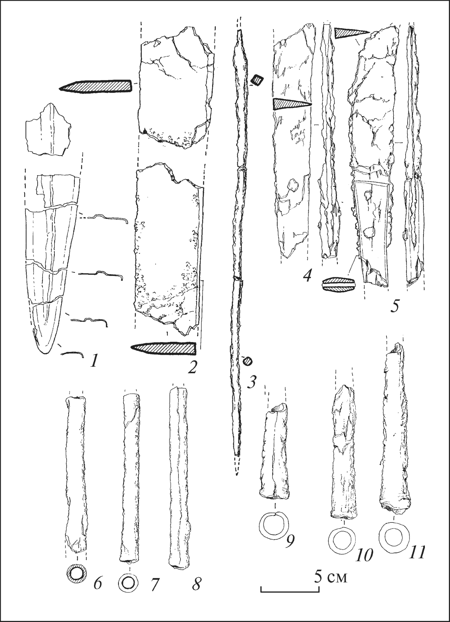 11-13. Втоки и втулки, уцелевшие от копья и дротиков. Длина копья 2,1 м, дротиков - 2,0 м (рис. 8, 6-11). Копья и дротики с втульчатым острием (а порой и втоком) часто случаются в скифских могилах. По данным А.И. Мелюковой, дротики наиболее характерные для IV в. до н. э., но известны и раньше (Мелюкова 1964, с. 44-45). Хотя со времени выхода ее работы появились новые ранние образцы такого оружия (напр.: Скорый 1997, рис. 44, 1), вывод исследовательницы подтверждены нынешним наблюдениями (Гречко 2010 г., стр. 76).