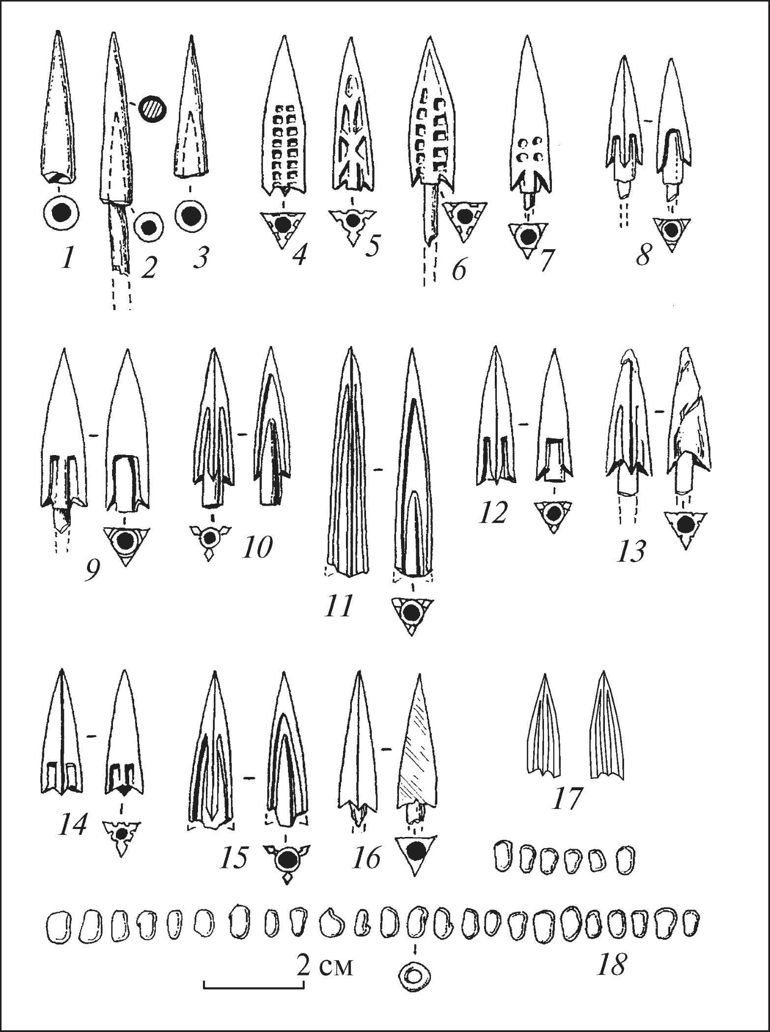 Распределить бронзовые острия по колчанам не удалось. В отчете описаны суммарно, поэтому приводим общее их описание. Два трехгранных наконечника со «сломанными» гранями, скрытой втулкой и опущенными ребрами граней, заканчивающиеся шипами. На гранях орнамент в виде двух рядов из восьми углубленных квадратиков (рис. 9, 4). Два трехлопастных острия с едва выдвинутой втулкой и жальцами на концах лопастей. Сбоку орнамент из перекрестных линий (рис. 9, 5). 89 трехгранных наконечников со «сломанными» гранями, немного выдвинутой втулкой и ребрами с шипами на конце. На боковой поверхности орнамент из двух рядов квадратиков (рис. 9, 6). Многочисленные (120 экз.) Трехгранные острия с выдвинутой втулкой, «жальце» и орнаментом из четырех углублений, образующих крест (рис. 9, 7). Два трехлопастные острие с «тяжелой» головкой, висунотой втулкой и шипастыми концами лопастей (рис. 9, 8) и еще один сходный с едва заметной втулкой (рис 9, 12). 40 похожих наконечников, но массивных и с едва выдвинутой втулкой (рис. 9, 9). Два трехлопастные острие с выдвинутой втулкой и «жальце» (рис. 9, 10). Два похожих со слабо выдвинутой втулкой (рис. 9, 15). Трехлопастный наконечник удлиненных пропорций со скрытой втулкой (рис. 9, 11). Трехгранный экземпляр с треугольными вырезами на основах граней, образующих шипы (рис. 9, 16). Подобное острие с двумя продольными канавками в основании (рис. 9, 14). Два похожих наконечника с впадинами на гранях (рис. 9, 13).