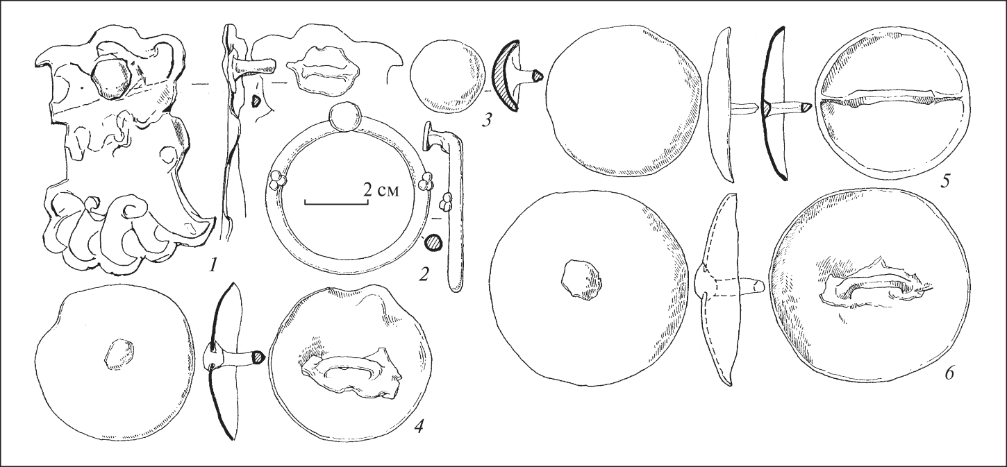 Пряжка круглая из бронзы с тремя выступами, два из которых оформлены в виде трех шишечек, а третий – грибовидные (рис. 10, 2). Эта пряжка диаметром 5,5 см одна из крупнейших такого типа. Последние хорошо известны в степной зоне и Днепровском Лесостепи, датируются концом V-IV вв. до н. э. (Могилов 2008, с. 64).