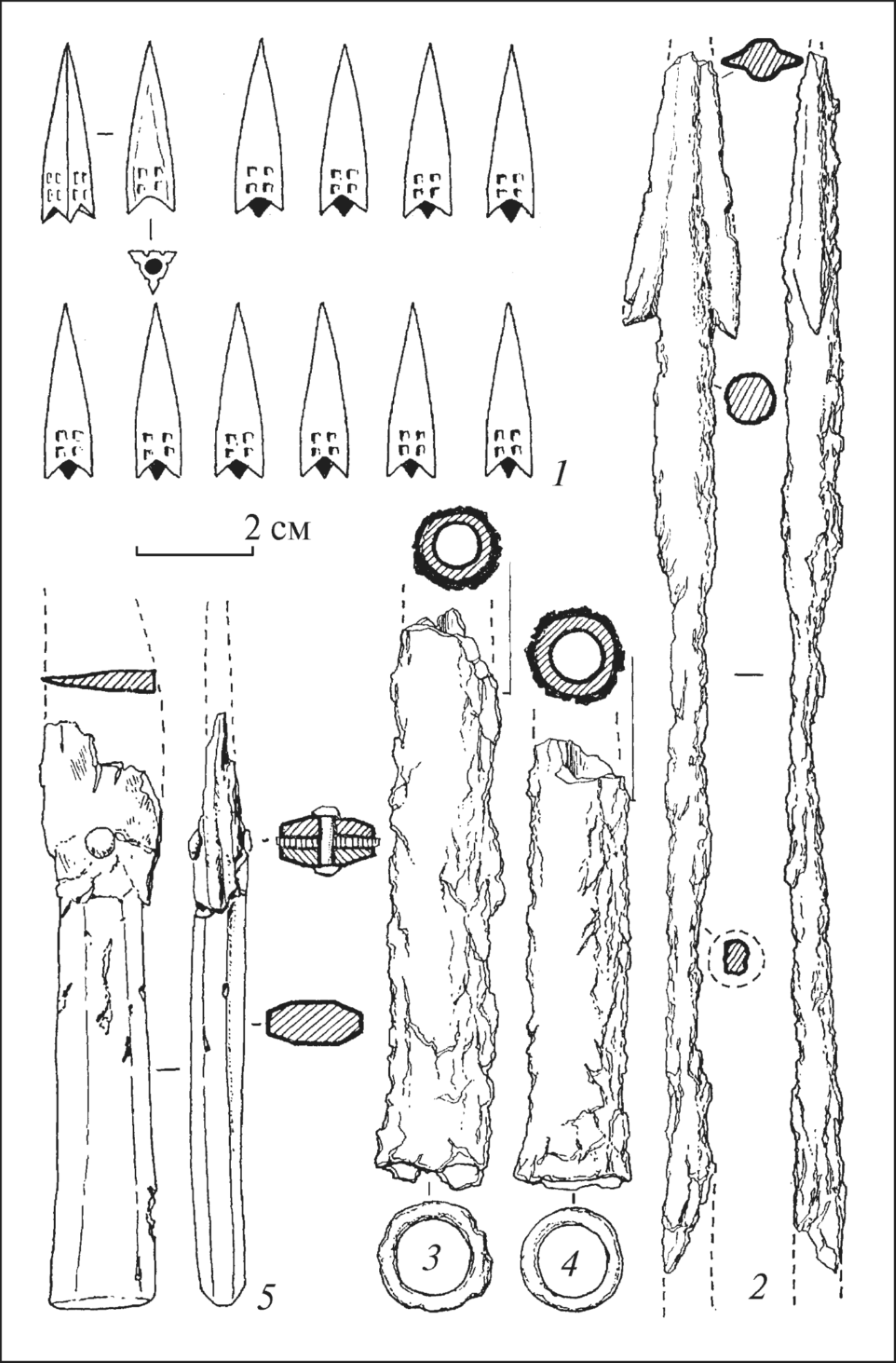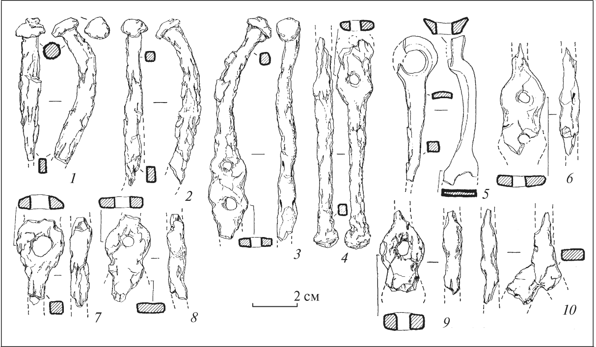 7. Второй набор состоял из шаровидных одного костяного острия (рис. 9, 1) и девяти деревянных (рис. 9, 2, 3), а также 73 бронзовых трехгранных с выдвинутой втулкой и «орнаментом» со стороны.
